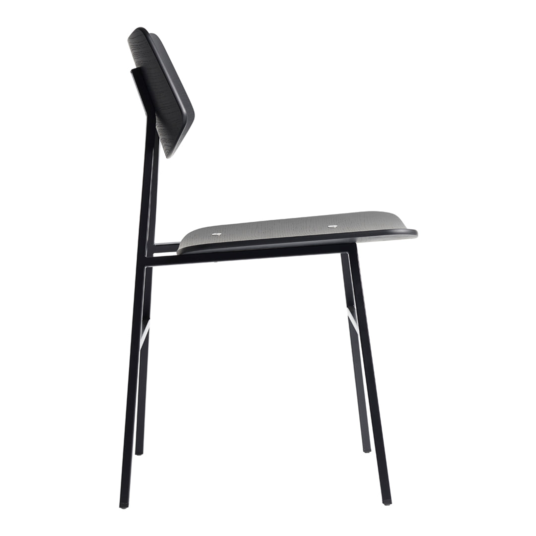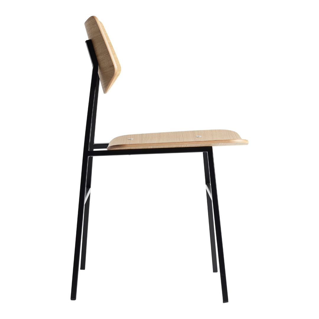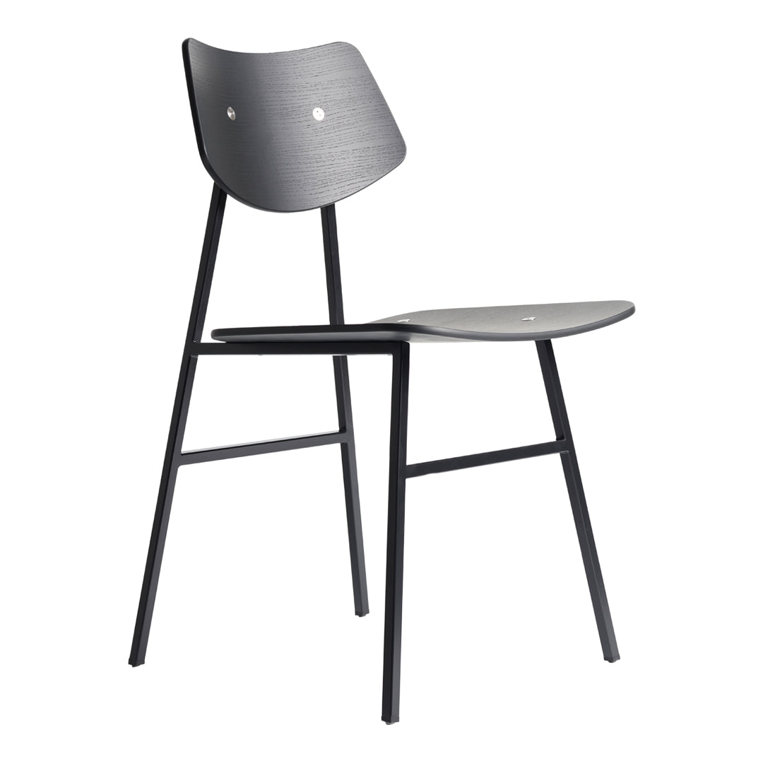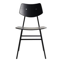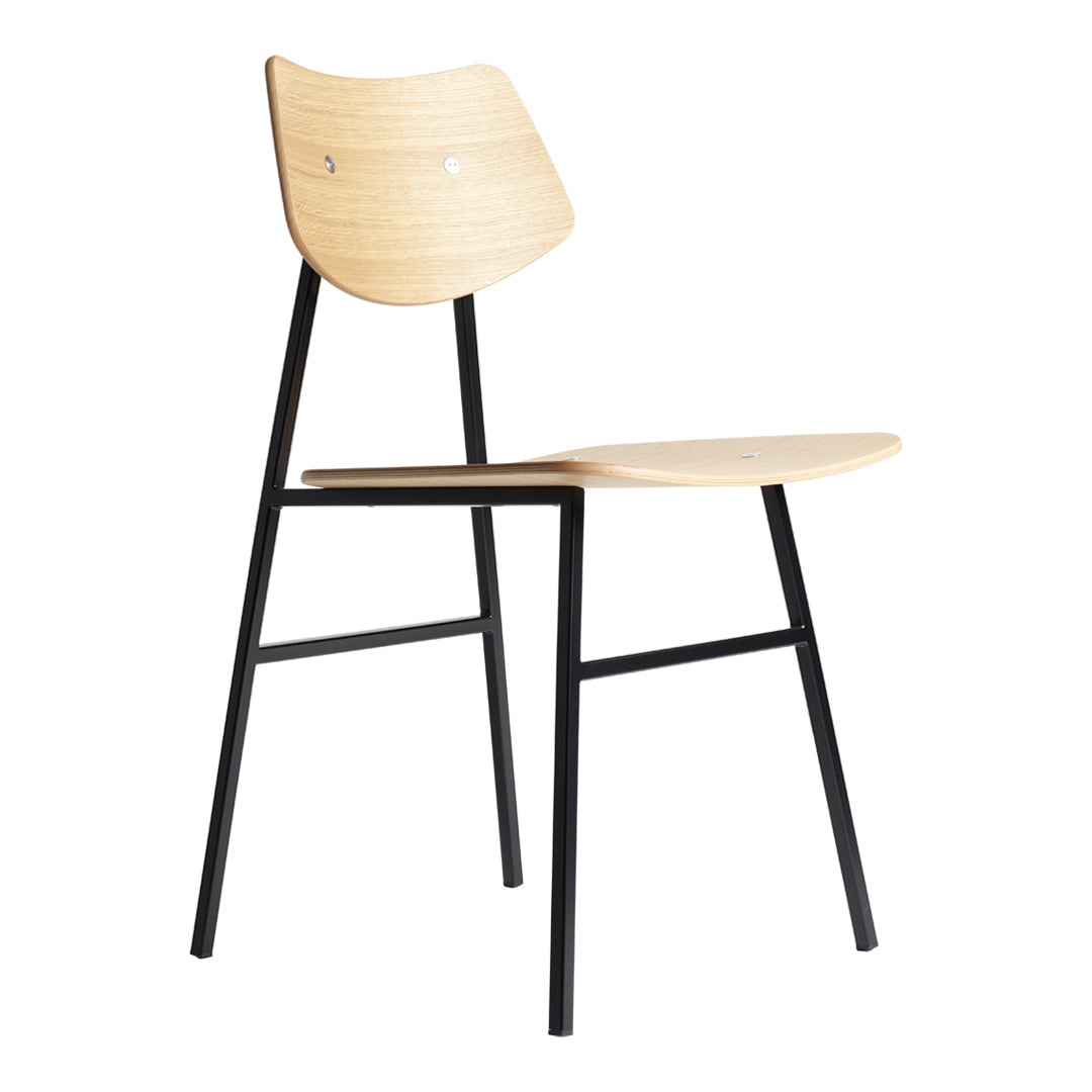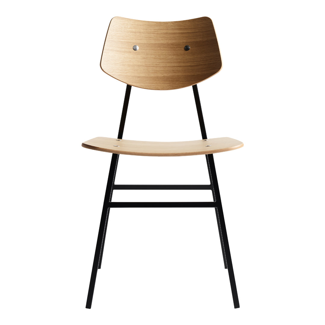 Geometric lines meet smooth curves in the 1960 Chair. The fluent curves of the plywood are supported by a square frame, which creates a lightweight chair with a dynamic feel. The 1960 Chair allows for comfortable sitting on a well-shaped plywood seat.The seat and backrest are also available with offset upholstery, which creates additional comfort without diminishing the contours and subtleness of the original design.