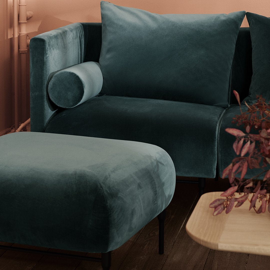 A luxurious modular sofa with an elegant, attractive idiom, created by the talented Danish designer, Rikke Frost. Galore exudes the decadence of yesteryear in a contemporary interpretation, adding ambience and texture to any modern interior. This Galore modular sofa provides countless options for adorning a room of any shape or size. It is also easy to move around. Depending on your character and temperament and the other accessories in the living room, the modular sofa can be styled in various ways: ranging from a crisp, elegant look to a relaxed, luxurious approach with an abundance of soft cushions. For extra comfort and elegance, you can extend the sofa with a pouffe in the same range. The legs give the modular sofa a light, floating look, and the classic design universe is enhanced by historic cushions and stitching details that complete the luxurious appearance. The modular range comprises a central module, a right and left module and a chaise longue. They can be combined as desired. Choose from several different exclusive fabrics in exquisite shades and stunning combinations from the Warm Nordic universe. The modular sofa comes with cushions in various shapes and sizes.