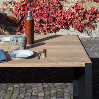 It has its origins in the Italian countryside in line with popular tradition and with the same solidity it splendidly reflects the panorama of contemporary architecture. Majestic and elegant, PANCO represents a sincere and generous convivial atmosphere. The tabletop is made of warm and resistant antique-finish Iroko wood. It has steel legs and a cut-out in its sides that conveys lightness and dynamic appeal. The bench, made of the same materials, complements the festive atmosphere and can be concealed under the table. In the company of your family or friends, harmony is achieved.