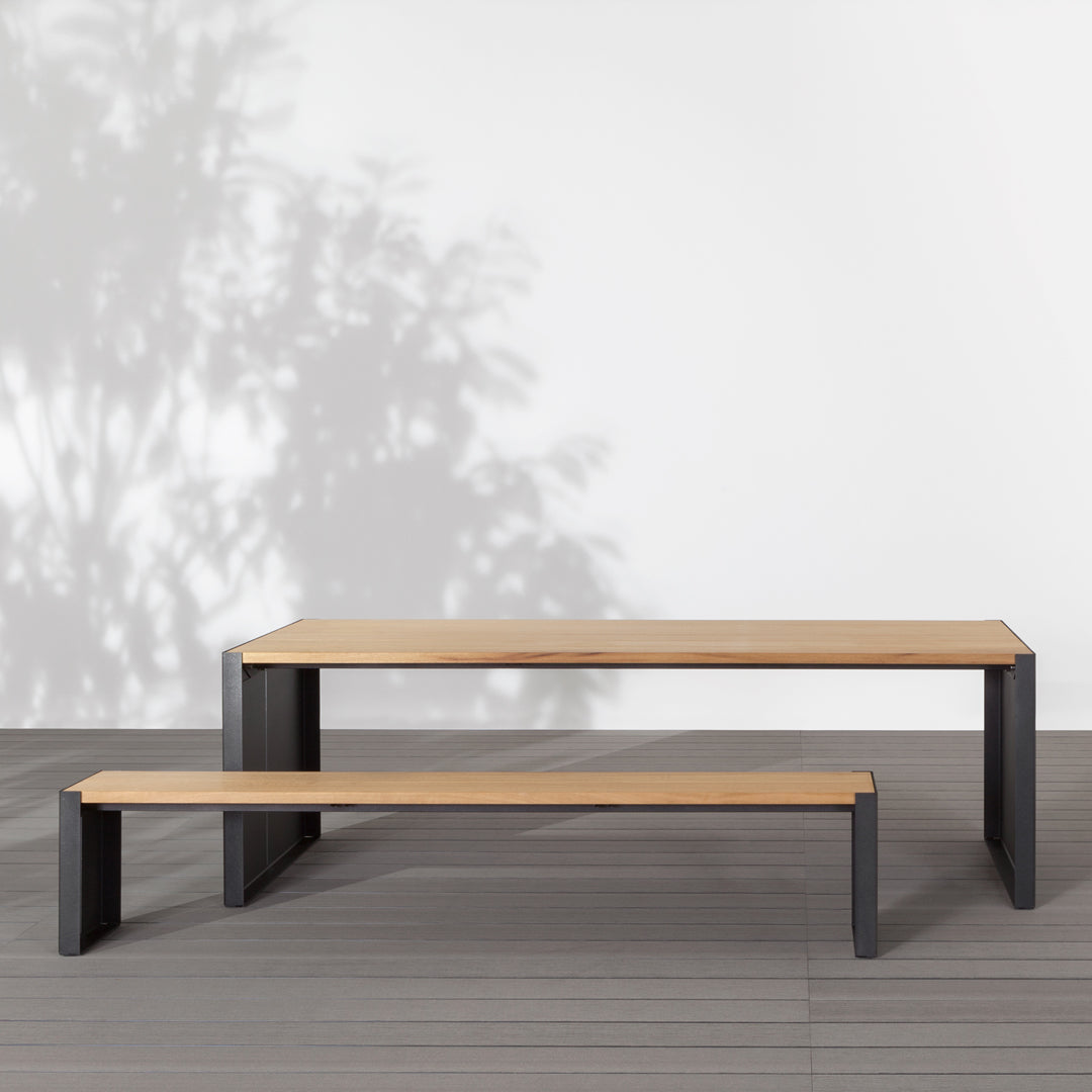 Table with base in bent powder coated stainless steel Aisi 304 sheet, tops in Iroko wood. Bench available in the same finishes.