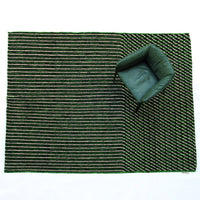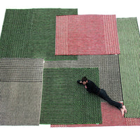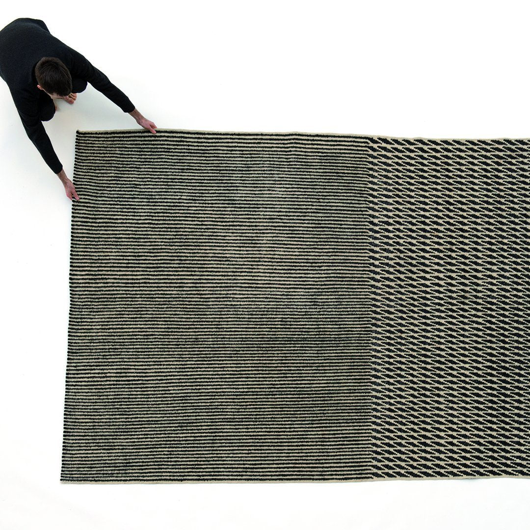 This blurred effect has been achieved by inverting the sense in which the kilims are traditionally woven, which makes the process much more laborious. This change in weaving causes the lines to be blurred, mixing two colours unevenly, creating an aged rug, reminiscent of the past.