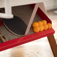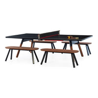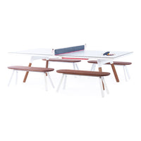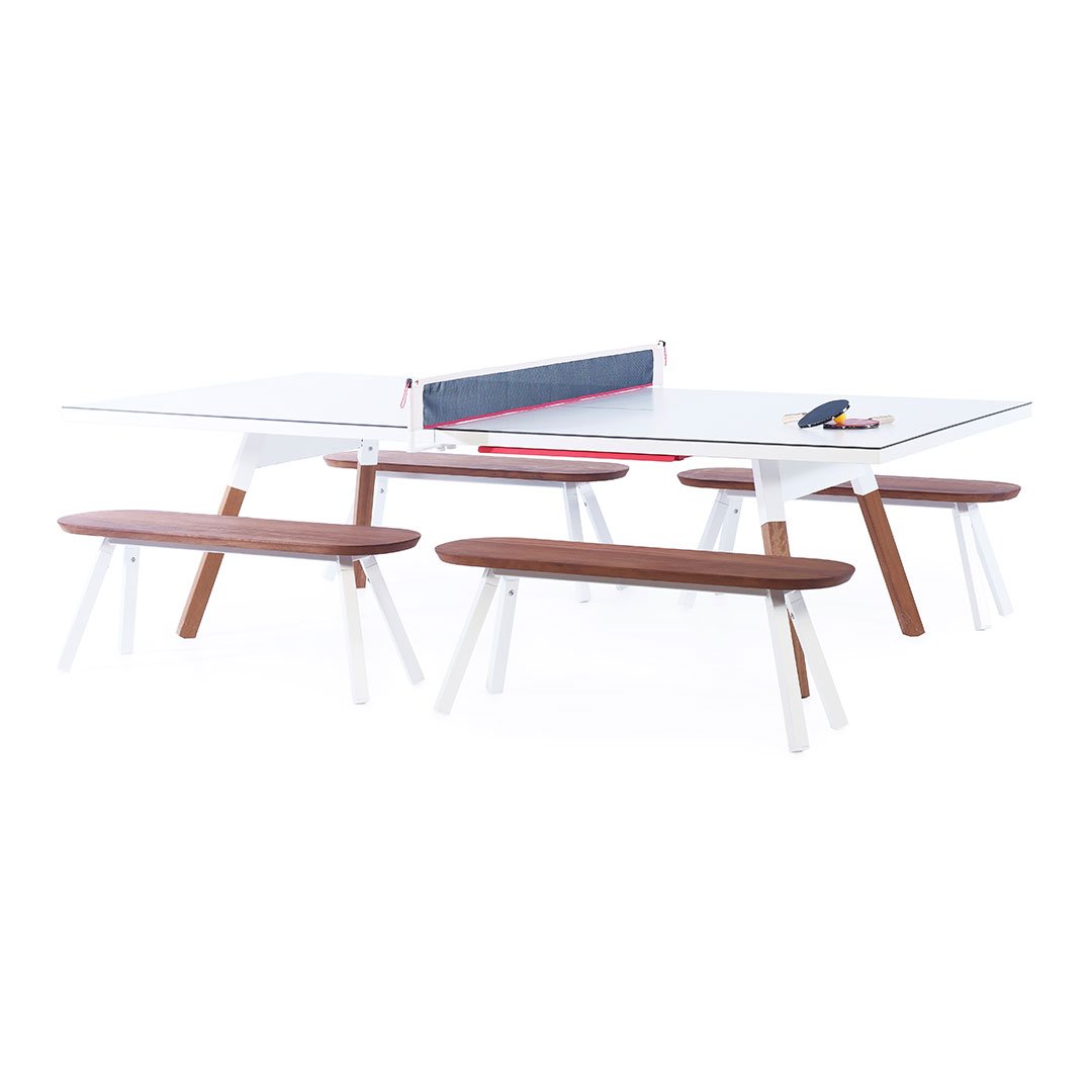 You and Me is a ping pong table, with dimensions, a playing surface, a design and a structure that offers full playability. Just like a professional table. When not in use, all the sporting elements – the net, the paddles and the balls – are stored in a discreet side drawer, completely out of sight. And the table is ready for other uses. Manufactured with high-quality, hardwearing materials, the table is ready for daily use and play. The black or white HPL top – the surface used in standard ping pong tables – is perfect for outdoor use. Designed to withstand inclement weather and temperature changes, it’s also easy to clean and maintain. You and Me comes in three sizes: Standard, with the standard dimensions of a ping-pong table; Medium-220 for tighter spaces and Small-180, suitable for more casual games or smaller players.