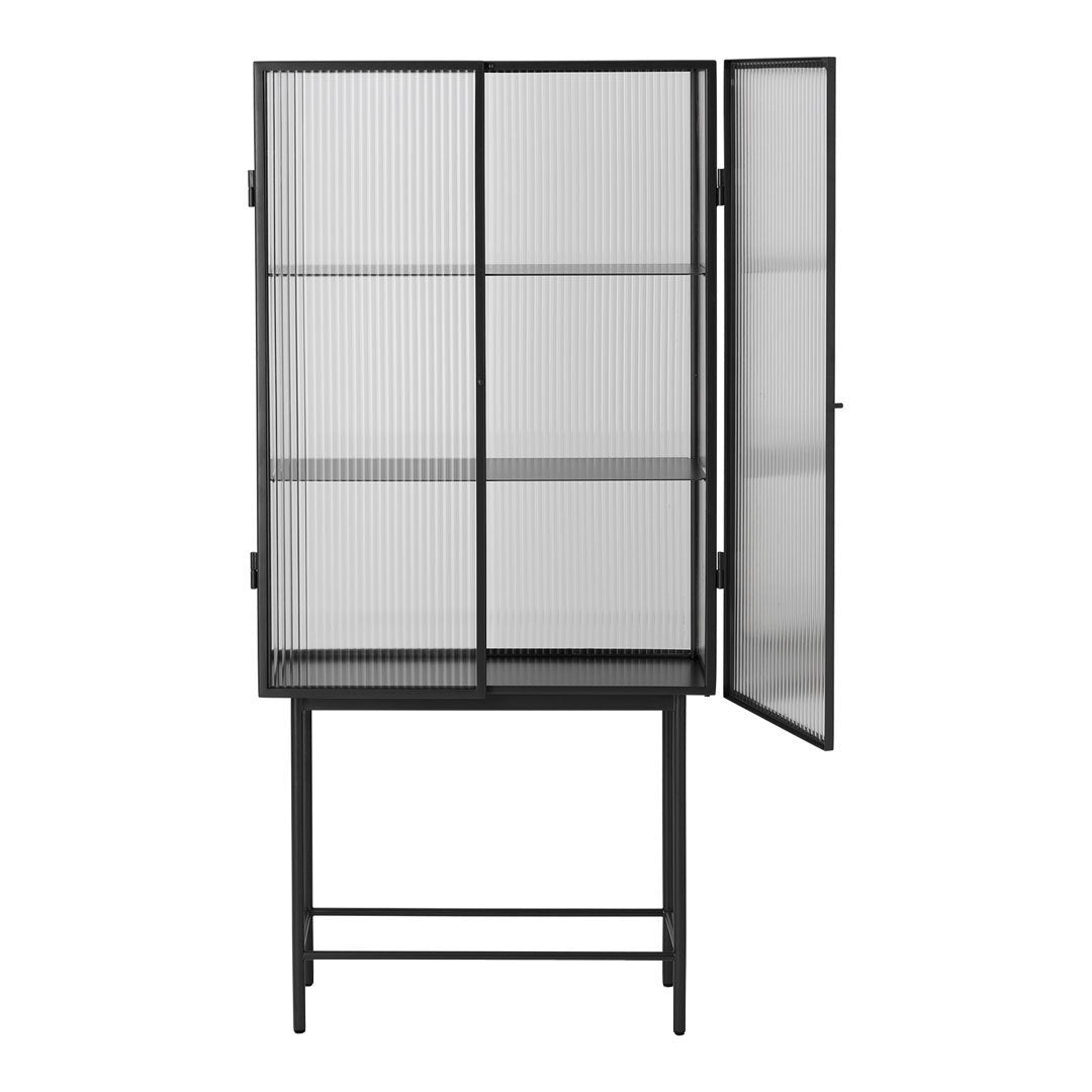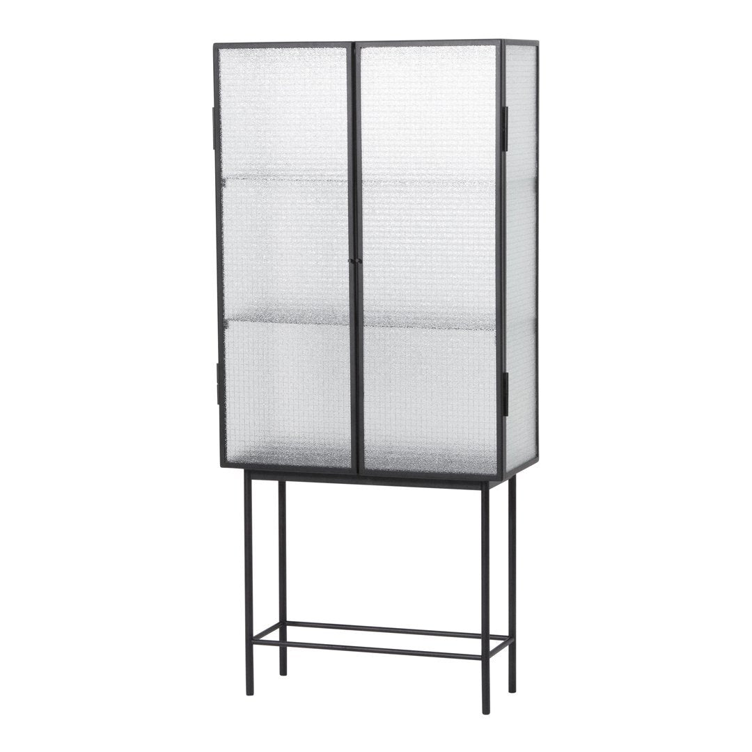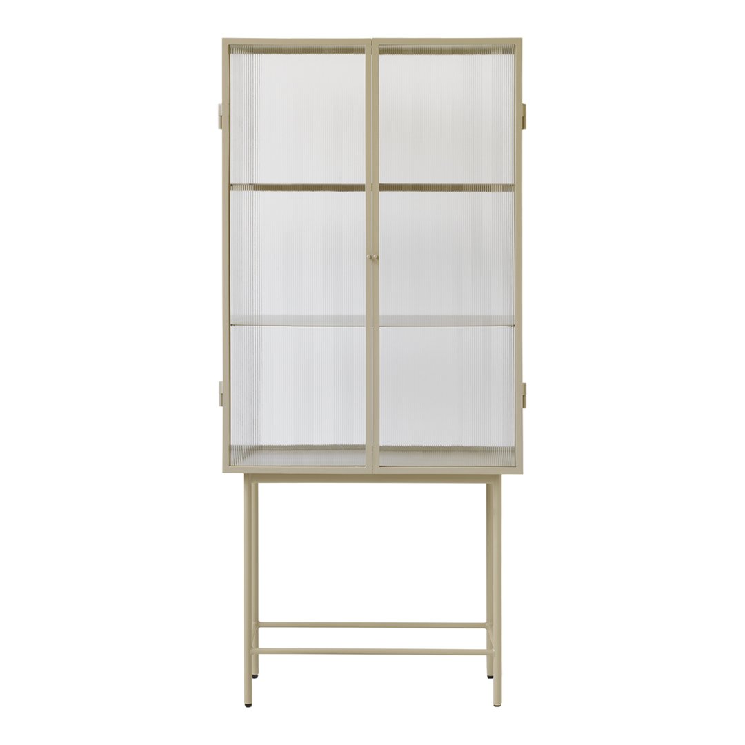 Opposites attract on this cabinet, crafted from sleek powder coated metal in soft, creamy color and corrugated glass. The glass doors close seamlessly and quietly thanks to magnets, and open to reveal two powder coated metal shelves. Use in the bathroom to stylishly store beauty essentials or as a modern focal point in your dining room to store dinnerware and more.