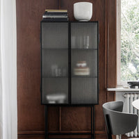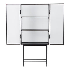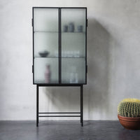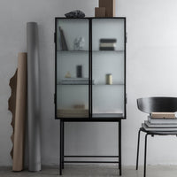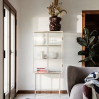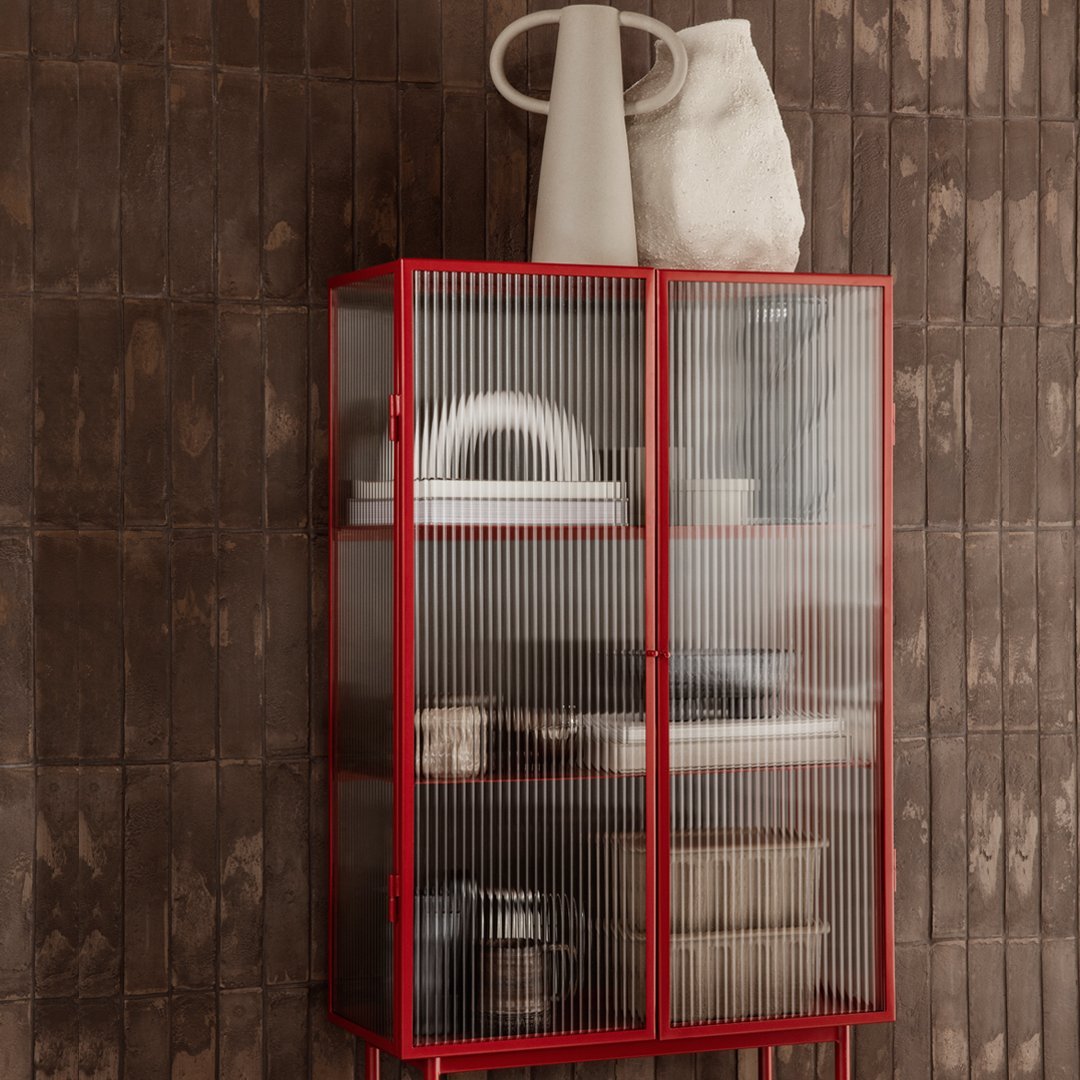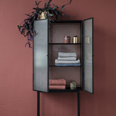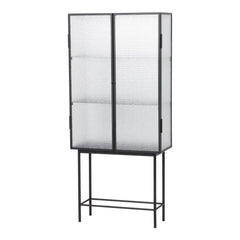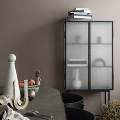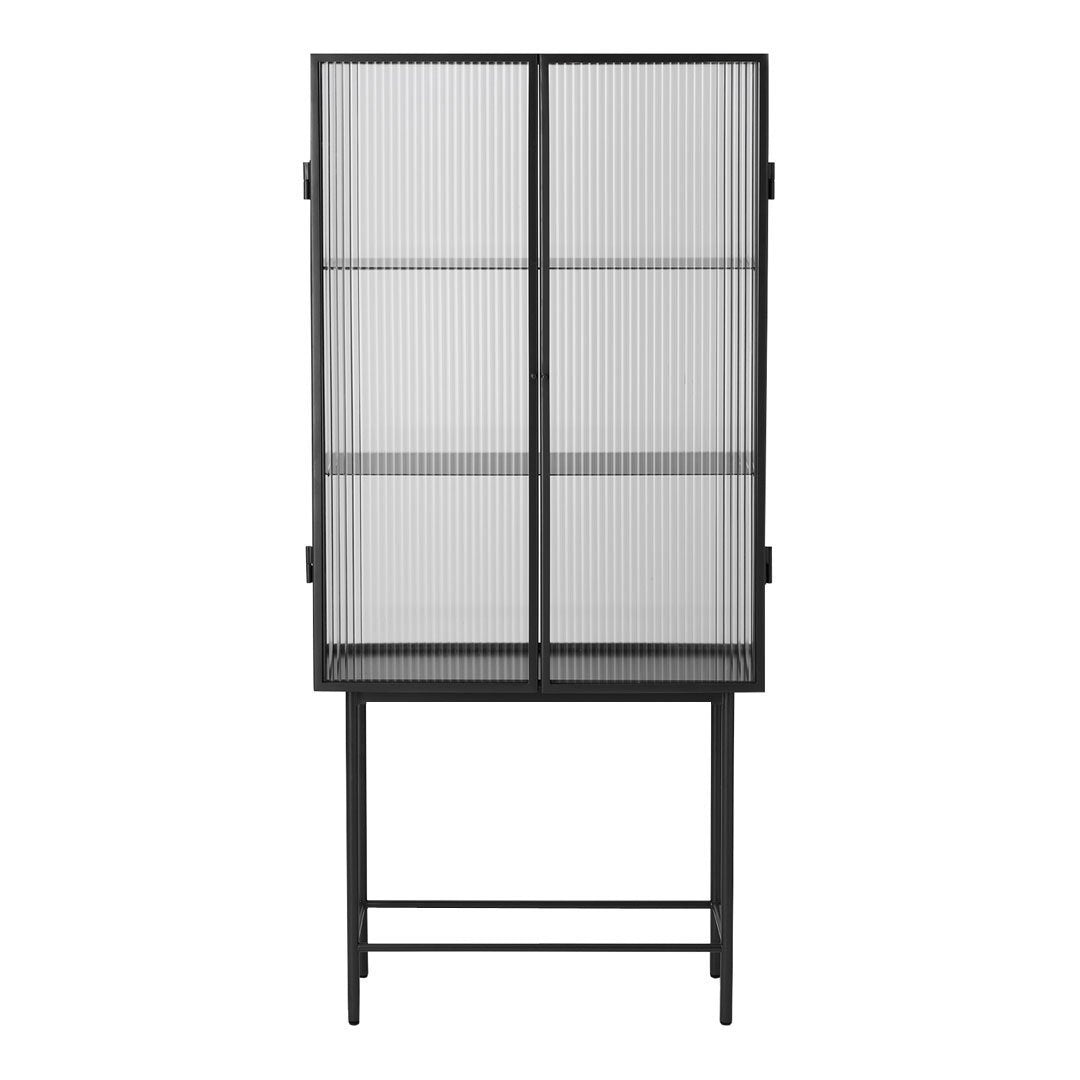 Opposites attract on this cabinet, crafted from sleek powder coated metal in soft, creamy color and corrugated glass. The glass doors close seamlessly and quietly thanks to magnets, and open to reveal two powder coated metal shelves. Use in the bathroom to stylishly store beauty essentials or as a modern focal point in your dining room to store dinnerware and more.