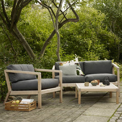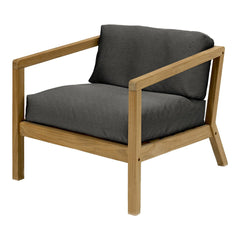 Virkelyst Chair is a modern outdoor furniture with the seating comfort of an indoor chair. The simple wooden frame strikes a contrast with the thick, soft cushions made in weather and water resistant Barriere textile.