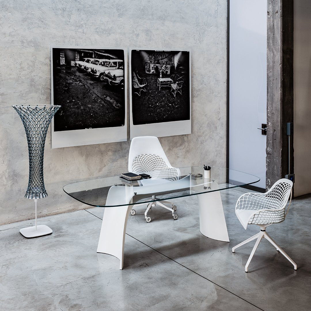 Guapa DPA CU is a swivel and height adjustable armchair. It is tilt-mechanism integrated and has a with five star base in lacquered steel. It comes with white wheels combined with a white base or with chrome wheels with black edge combined with the black base. Seat and backrest are in hide.