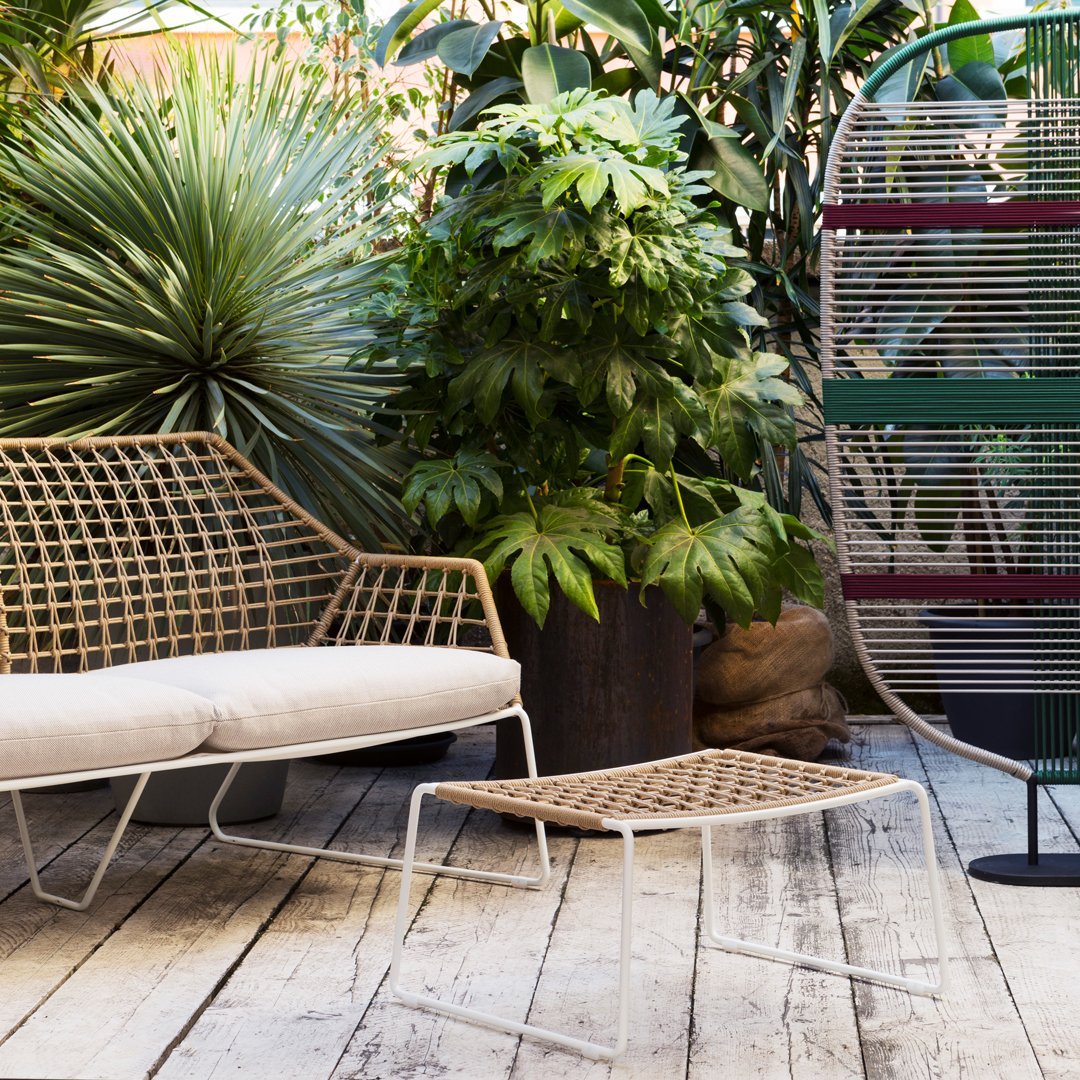 The New York outdoor collection expands with a line of exclusive woven seating made entirely by hand. New York Sofa Soleil is the product of careful research into materials and the desire to maintain the unique original design. Woven nautical cords of different colors softly cover the painted metal rod structure. The ergonomic cushion is covered in a quick-drying, non-absorbent technical fabric, and its superior performance in the Martindale test guarantees abrasion resistance as well as hygienic breathability. In 2020 the collection adds a new element: the Lounge Armchair. The New York Soleil embodies outdoor living with a casual style and colorful charm. It is available in different blends and solid colors. The collection includes a sofa, an armchair, a pouf, a chair with or without armrests and a stool. Fully removable covers.