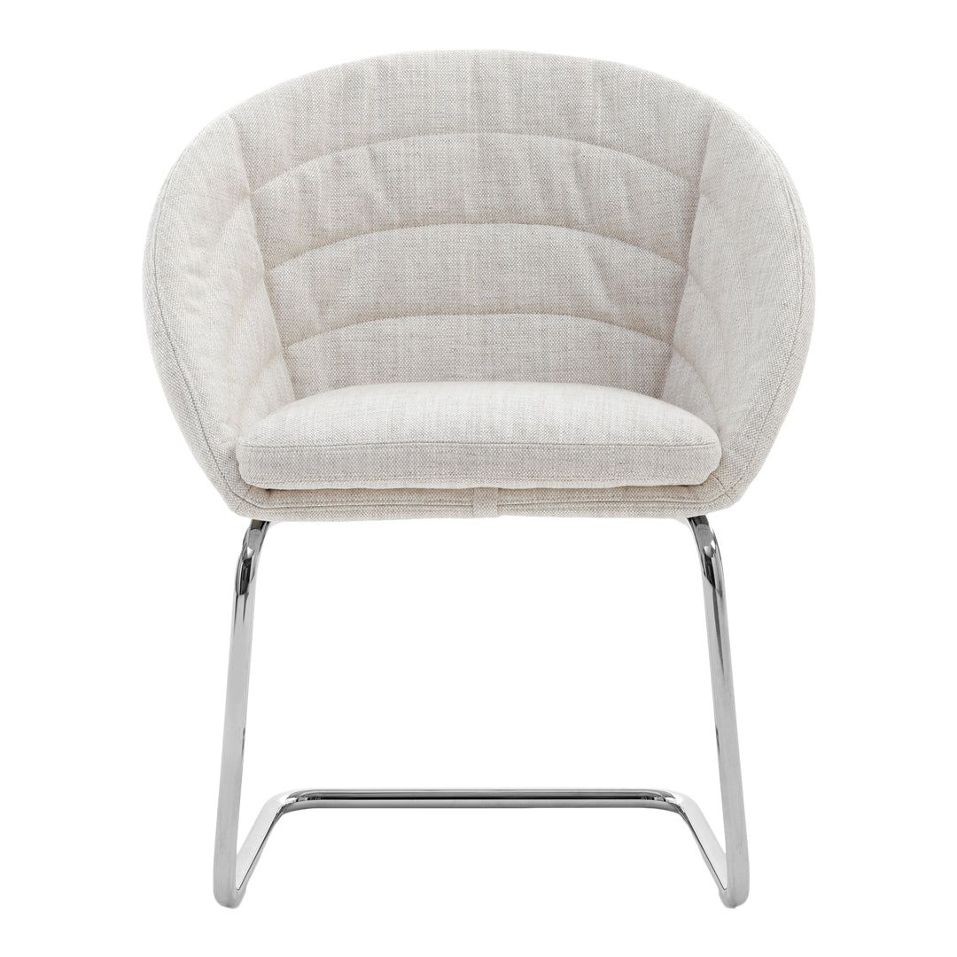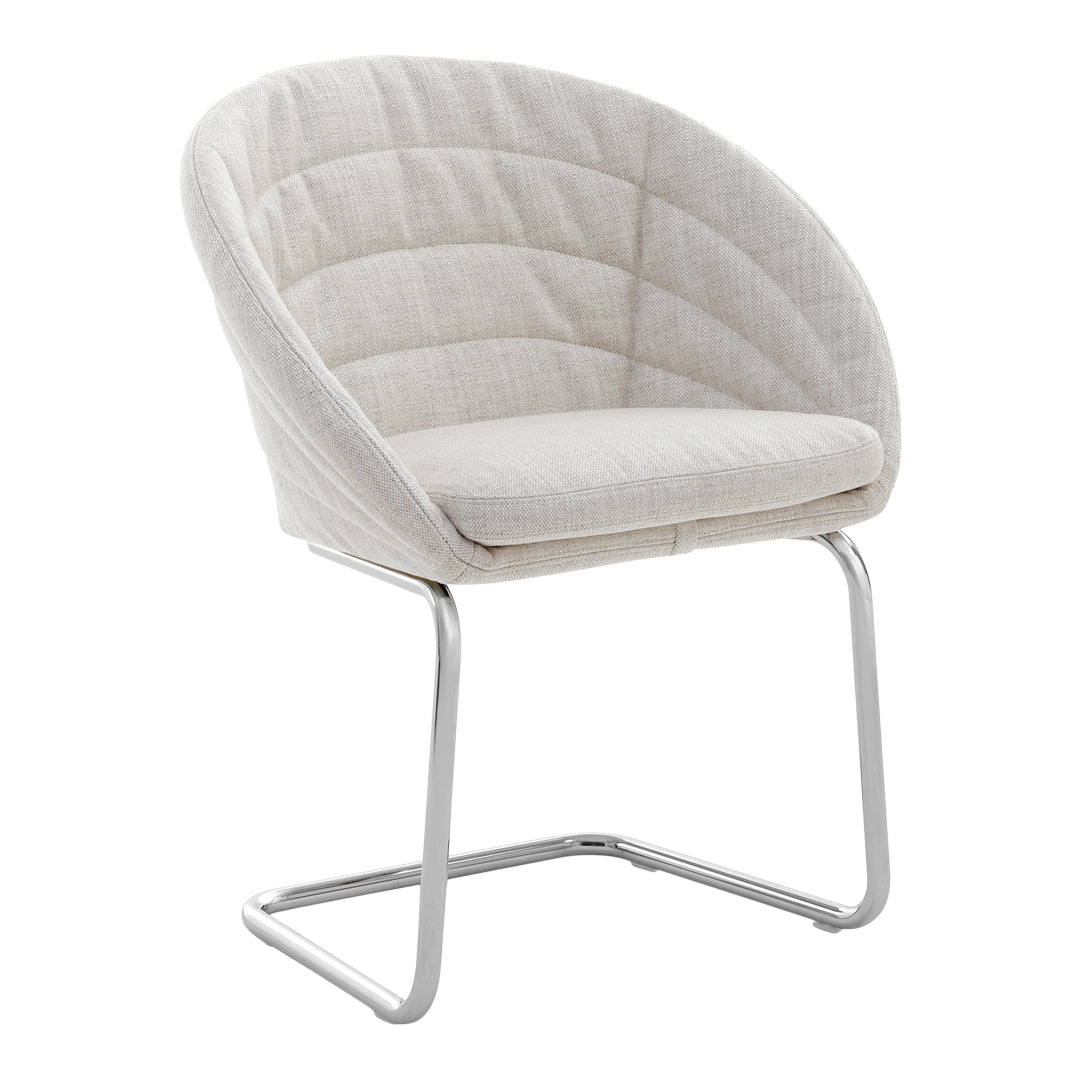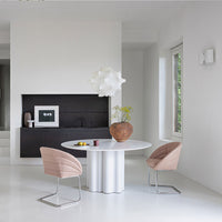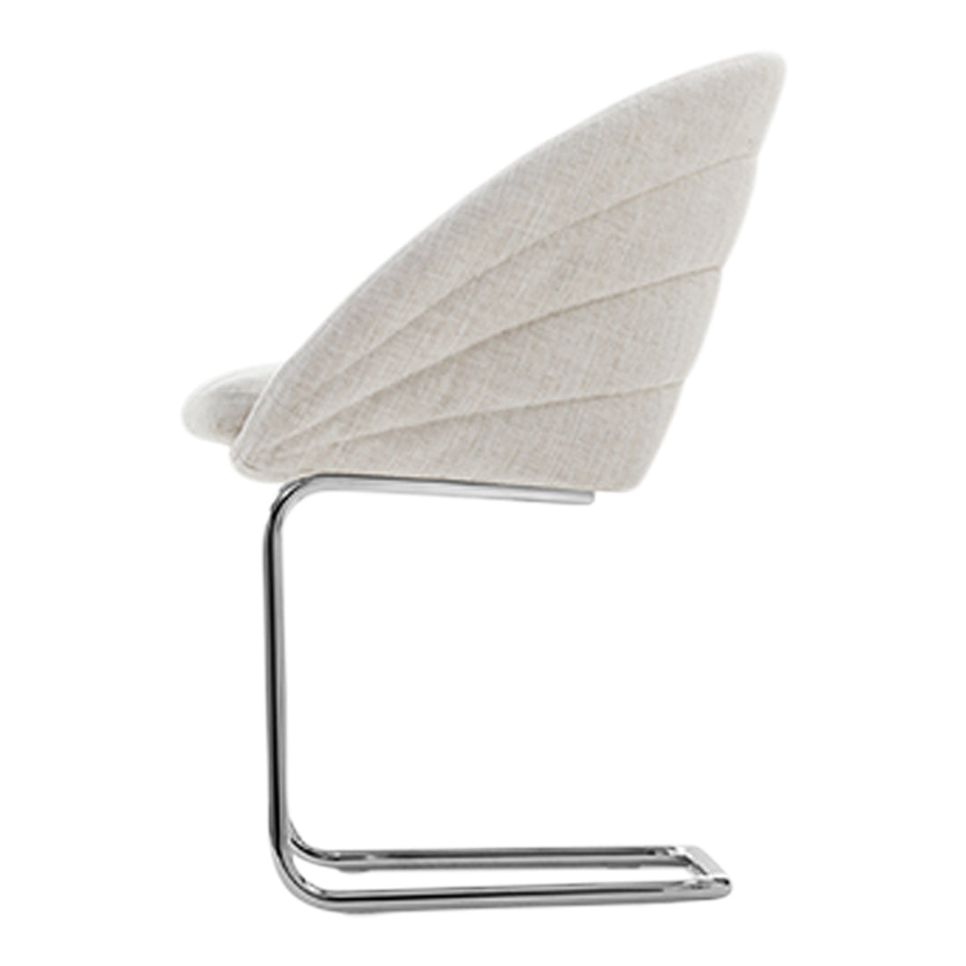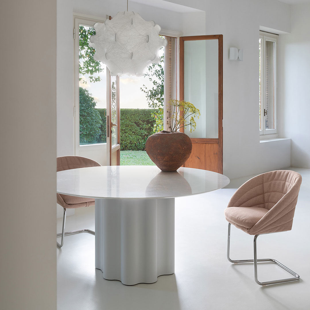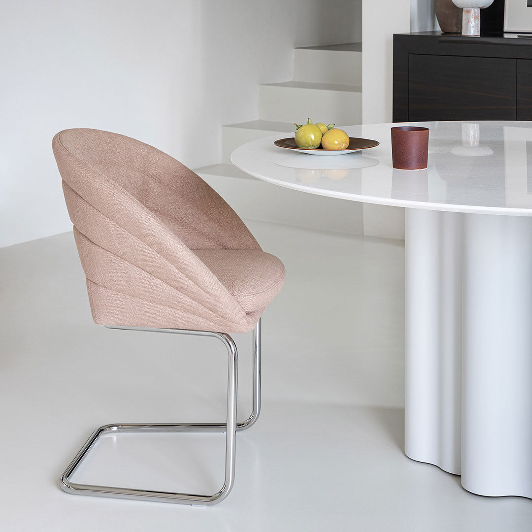 The Fleur armchair and the Petite Fleur chair, designed by Sergio Bicego, are inspired by the graceful forms of a flower and introduce a cantilever structure in the Saba chair and armchair collection. Despite their traditional cantilever function, ensuring a springy and flexible seat, these items are distinguished for their romantic allure and cocoon shape. Fully removable covers. From 2024, the upholstery of the armchair has been enhanced to make the overall comfort more enveloping.