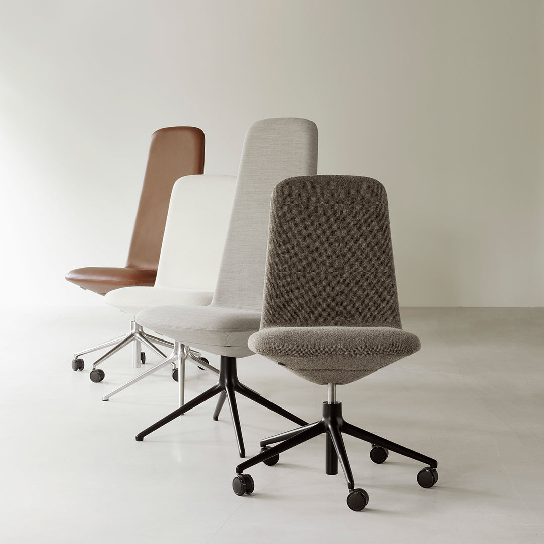 Off Chair is crafted with a specific focus on catering to the need for aesthetic office environments while providing a highly functional and versatile task chair with a meticulous attention to detail and comfort. Off Chair provides all the classic functions of a task chair with essential technical elements such as gas lift and tilt functions beautifully integrated into the construction of the chair. The design offers immediate comfort, providing the ideal conditions for a good working posture throughout the day. Off Chair obtains its minimalist expression through its rectangular, yet slightly rounded frame. Off is available with optional cushioned pads, which, in addition to their aesthetic appeal, serve to provide the design with further comfort. The seat and backrest come in either high or low in a wide selection of various fabrics and leathers, providing an array of color choices for personal customization. The possibility of choosing a chair with or without armrests allows for tailoring it to any specific need, taste or setting.