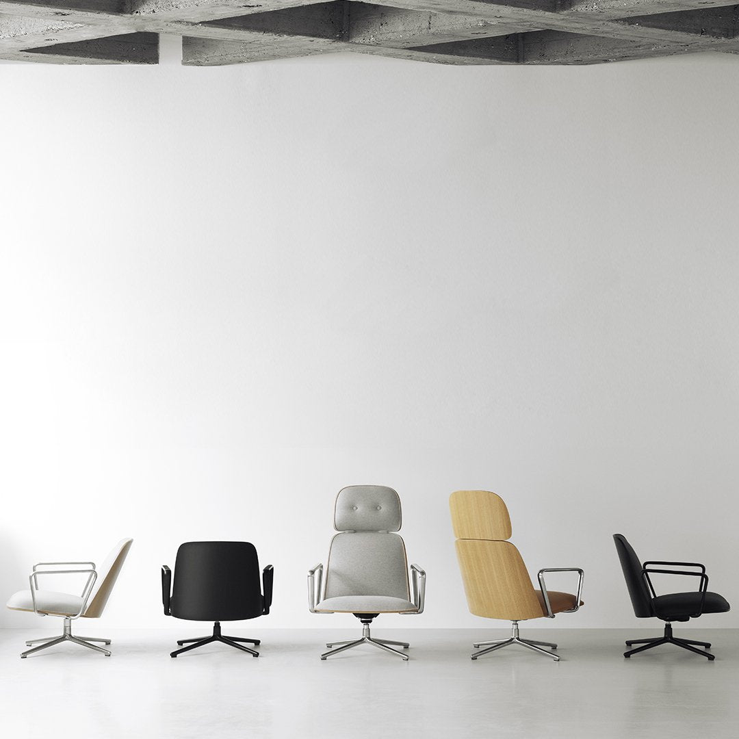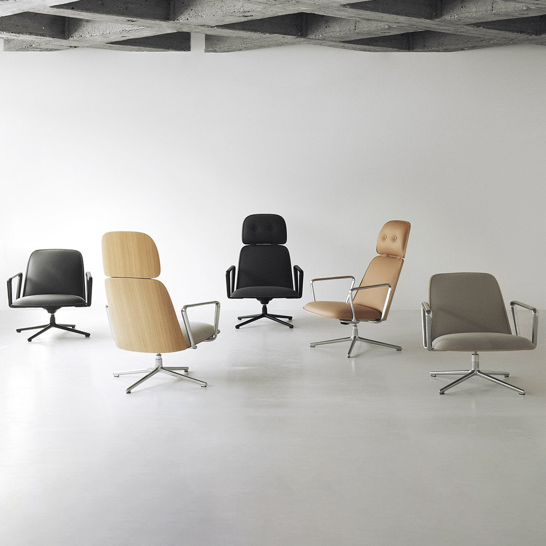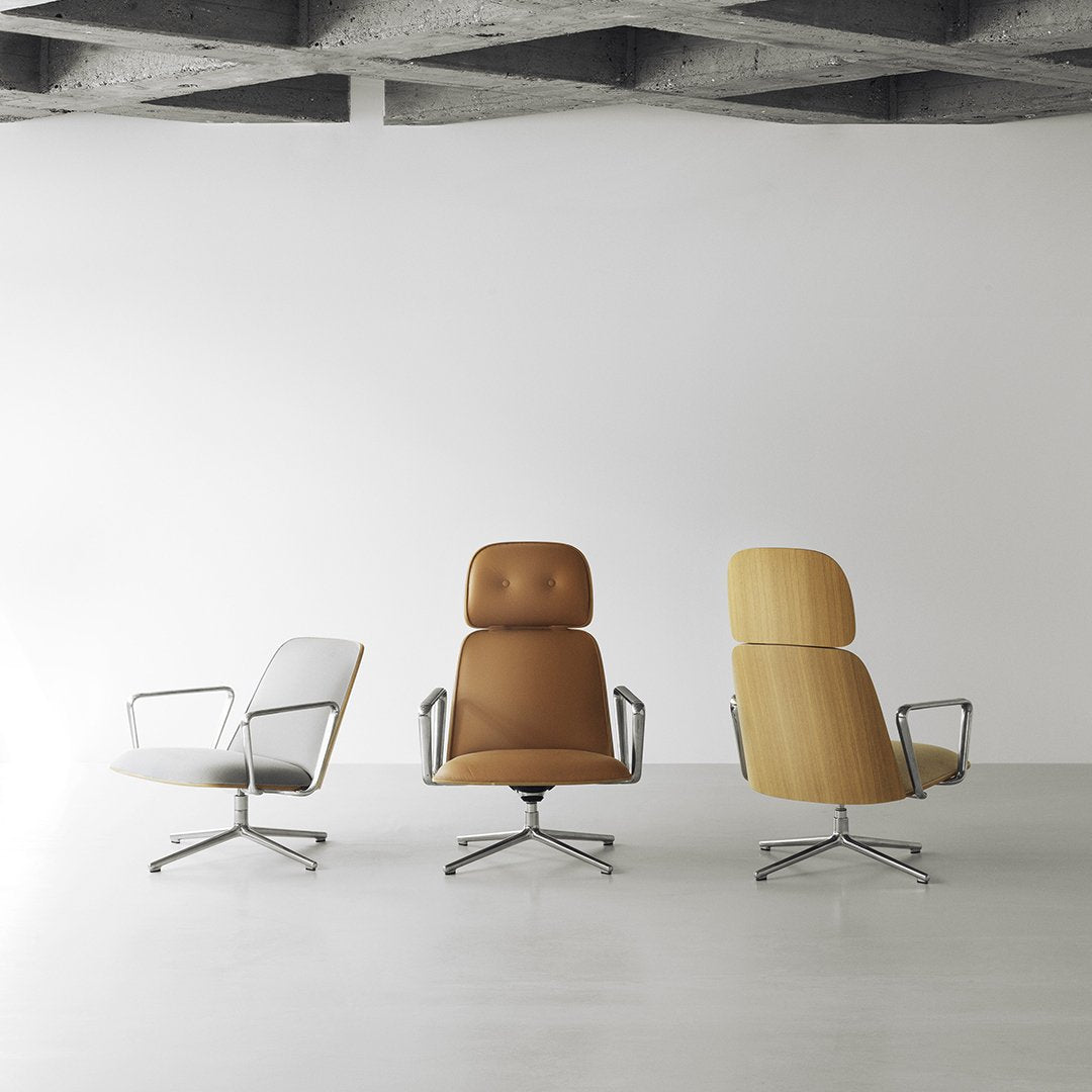 Pad Chair Swivel consists of a shell made of lacquered oak veneer or painted ash veneer with molded PU foam and front upholstery. Inside the upholstery and PU foam, the chair has a steel reinforcement structure. The swivel base is made of polished or black powder coated aluminum. Tilt function with inclination from 6.5° to 16.5°. Pad is delivered assembled.