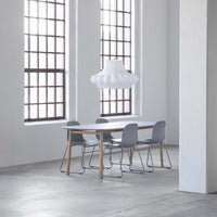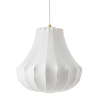The lamp is made by spraying thin threads of flame-retardant resin on a steel frame. Many layers of threads will make the full lampshade, like a silkworm makes its cocoon.