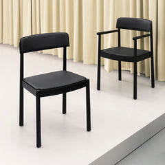 The chair comprises a frame of solid ash and a wide, comfortable seat and backrest made from ash veneer. Timb is available in a golden brown (tan) or black lacquered edition, either with or without armrests.