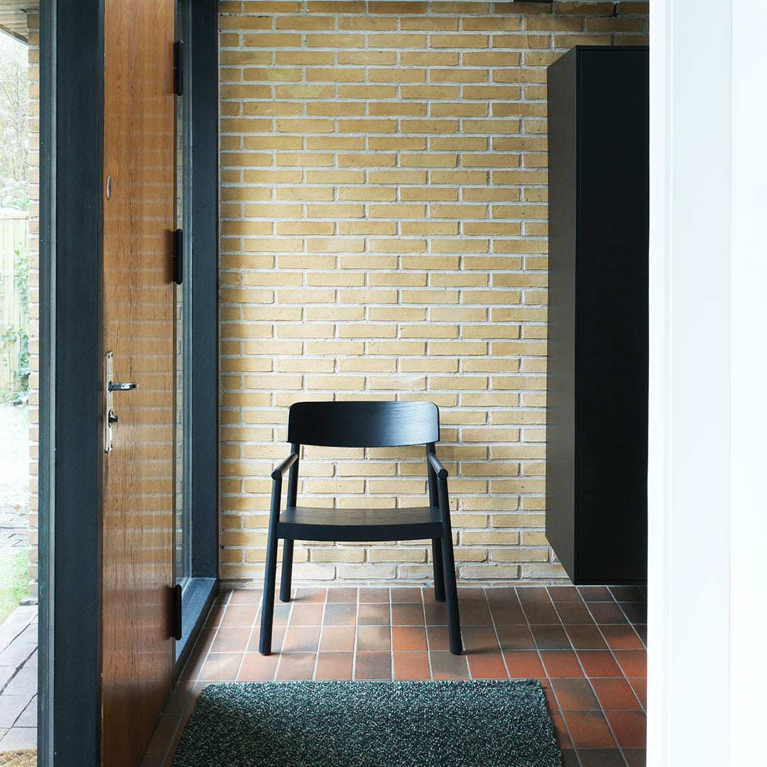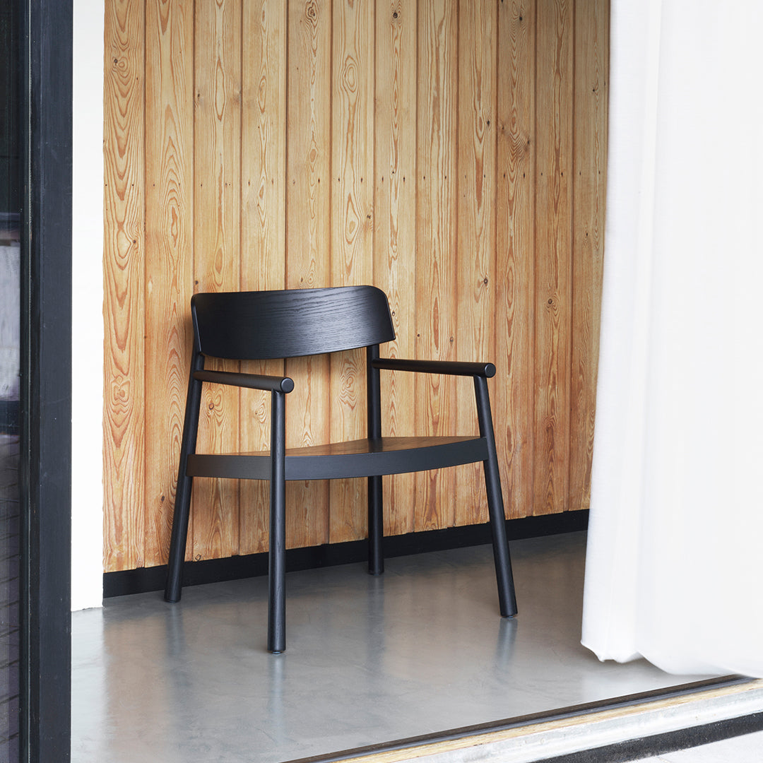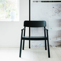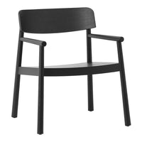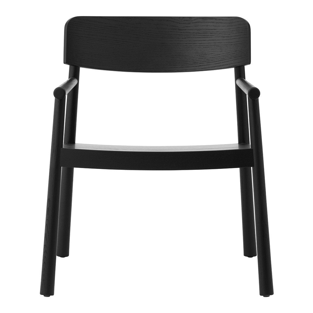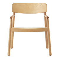 The chair comprises a frame of solid ash and a wide, comfortable seat and backrest made from ash veneer. Timb is available in a golden brown (tan) or black lacquered edition, either with or without armrests.
