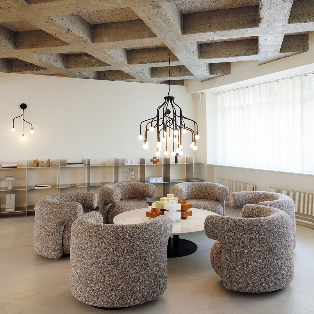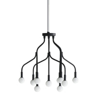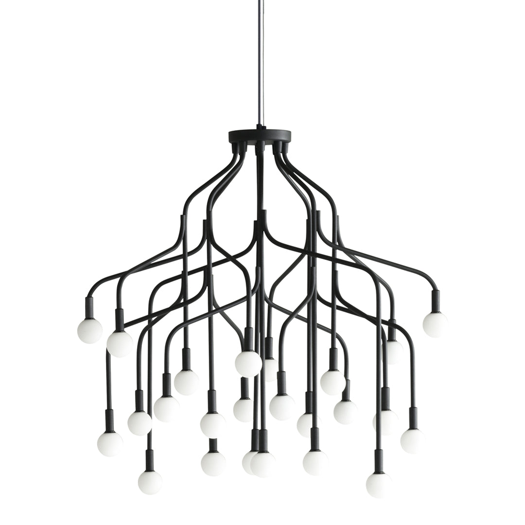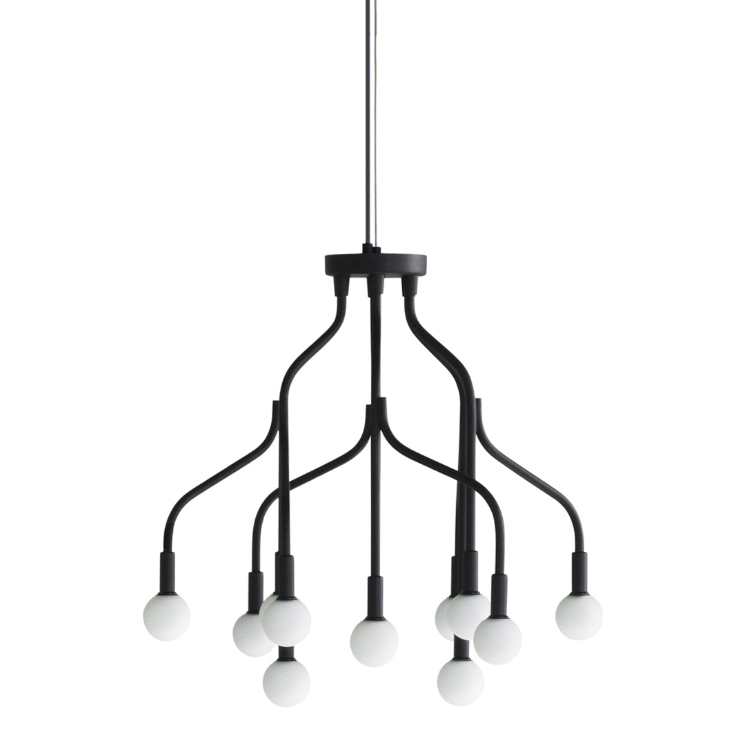 Vekst is a decorative lamp collection characterized by its sculptural branch-like arms, which are made of powder-coated steel and equipped with a light bulb surrounded by a ball of opal glass. The Vekst collection has a unique design and expressive light and is available as dimmable pendant lamps in two different sizes as well as a decorative wall lamp variant.