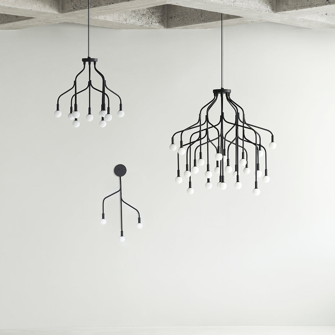 Vekst is a decorative lamp collection characterized by its sculptural branch-like arms, which are made of powder-coated steel and equipped with a light bulb surrounded by a ball of opal glass. The Vekst collection has a unique design and expressive light and is available as dimmable pendant lamps in two different sizes as well as a decorative wall lamp variant.
