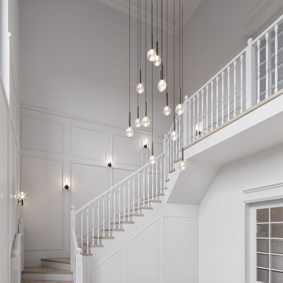 Miira 13 is a chandelier with 13 single pendants attached to a round ceiling plate, creating the chandelier appearance. The pendants can be adjusted in different formations. The Miira 13 chandelier has a light and narrow silhouette with glass globes of 14 cm in diameter whereas the Miira 13 Large has an ample and weighty expression. Suitable over a dining table, for stairs and hallways or in a corner.