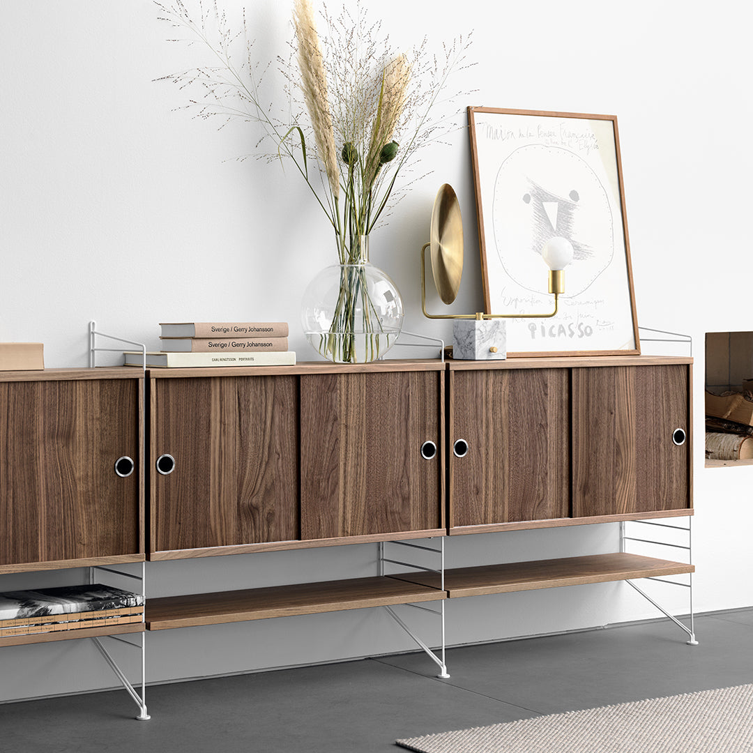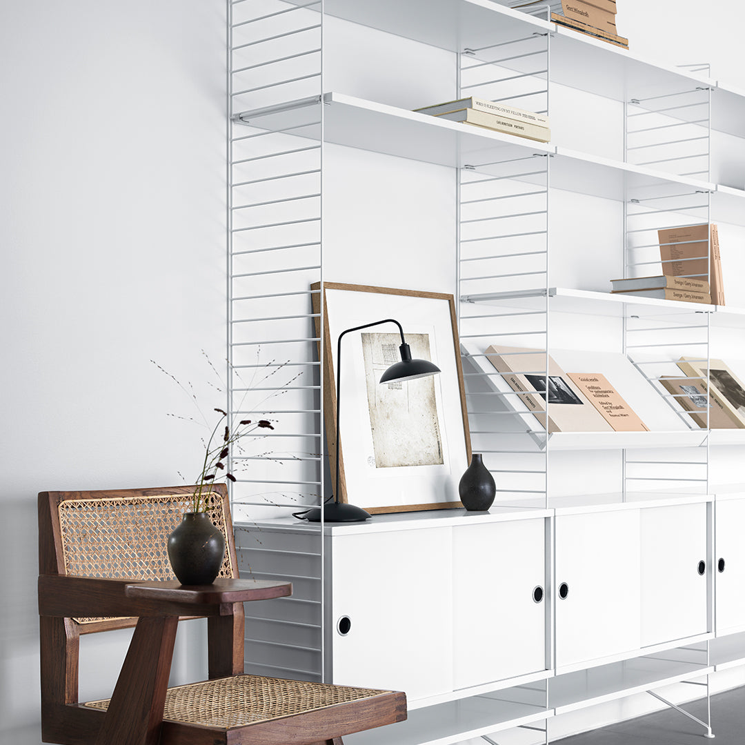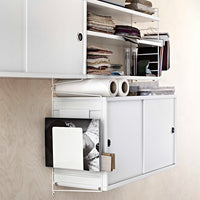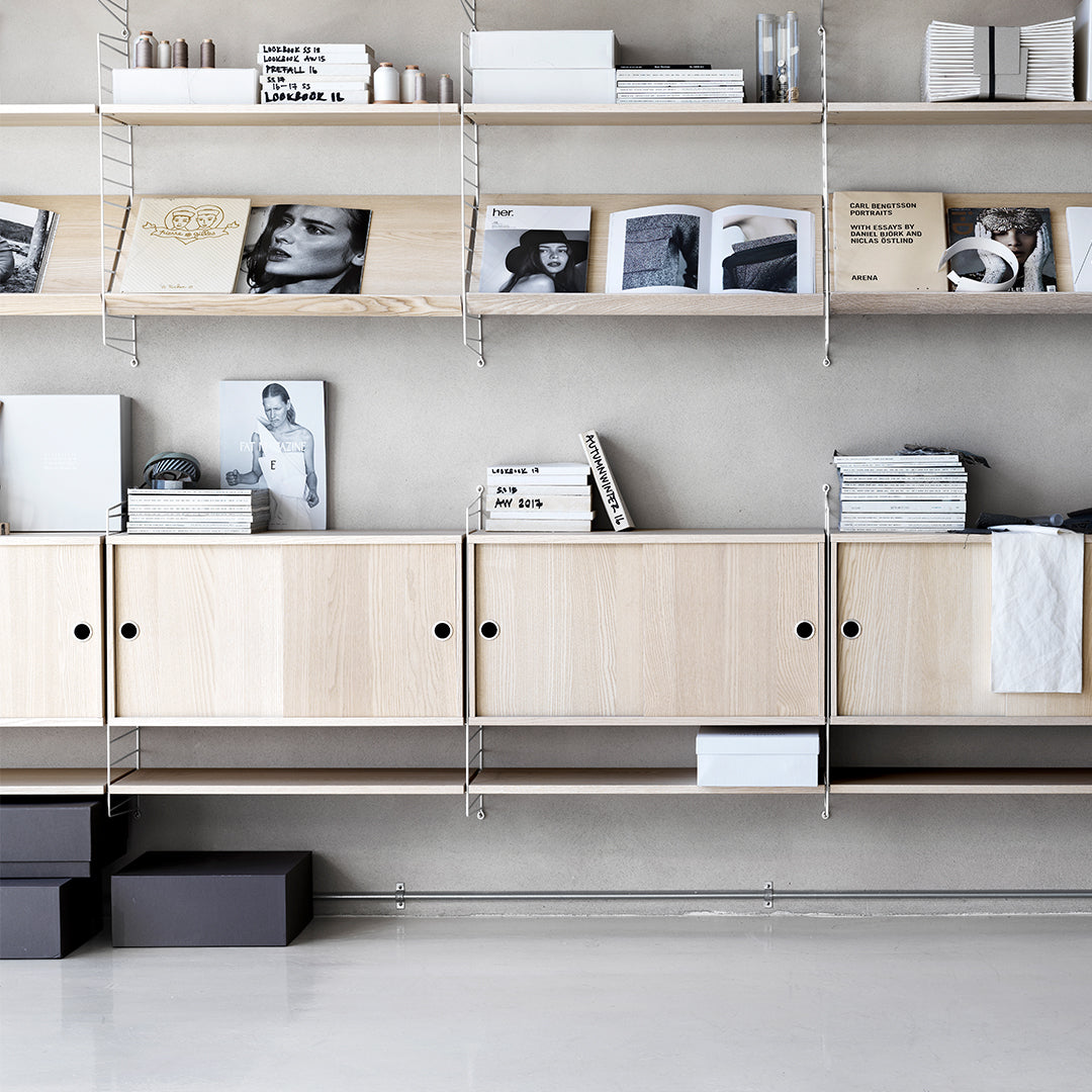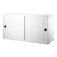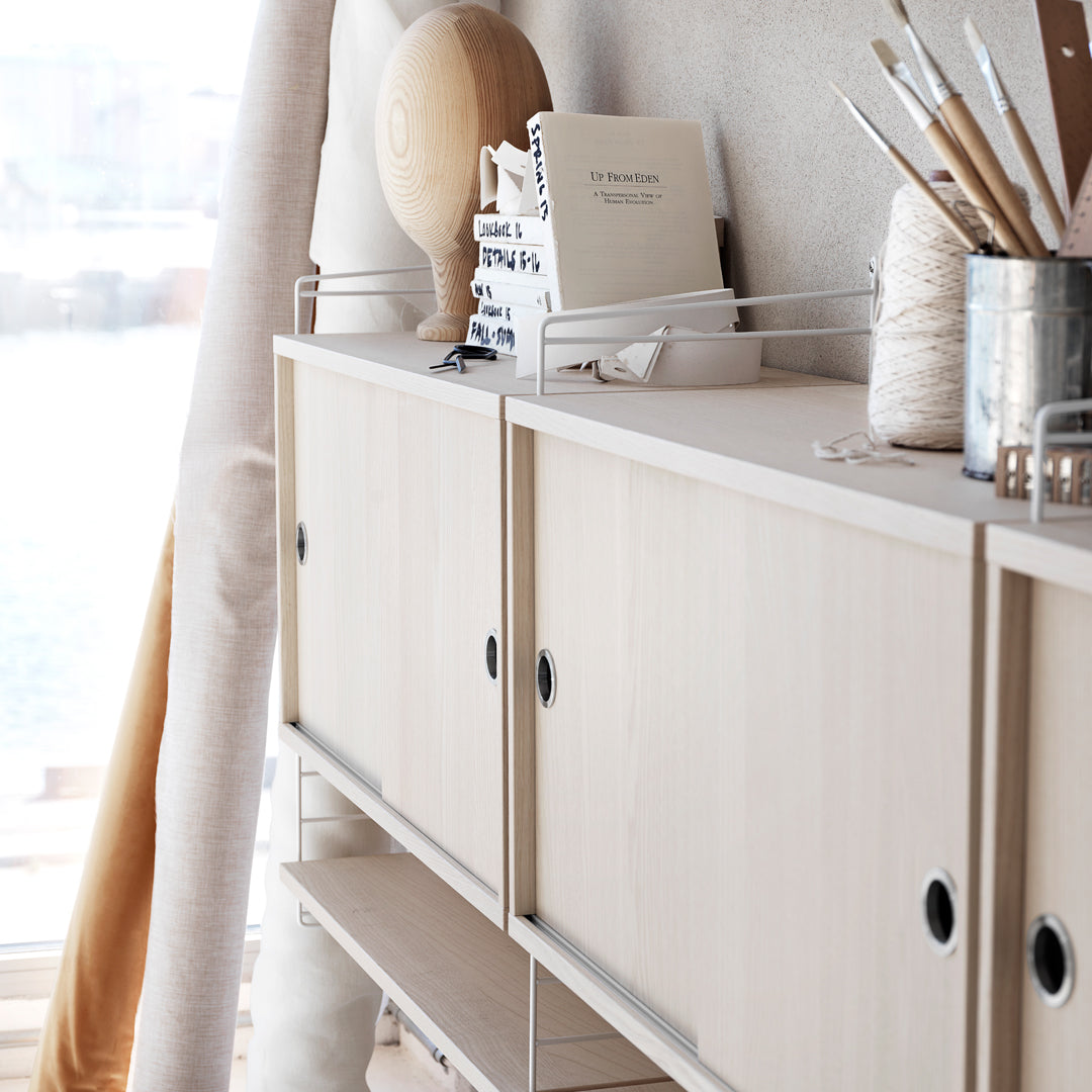The cabinets with sliding doors are available in one width, 78 cm, along with two depths, 20 and 30 cm. The cabinets fit into all wire and plex panels from String® System. It is visually pleasing to add a bolder element to your shelf, like a cabinet, which also give you a lot of extra storage. The cabinet consists of one divider placed in the middle along with two adjustable inner shelves. The cabinet’s inner dimensions are 4 cm less than the outer dimensions. The cabinets are delivered unassembled.