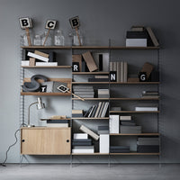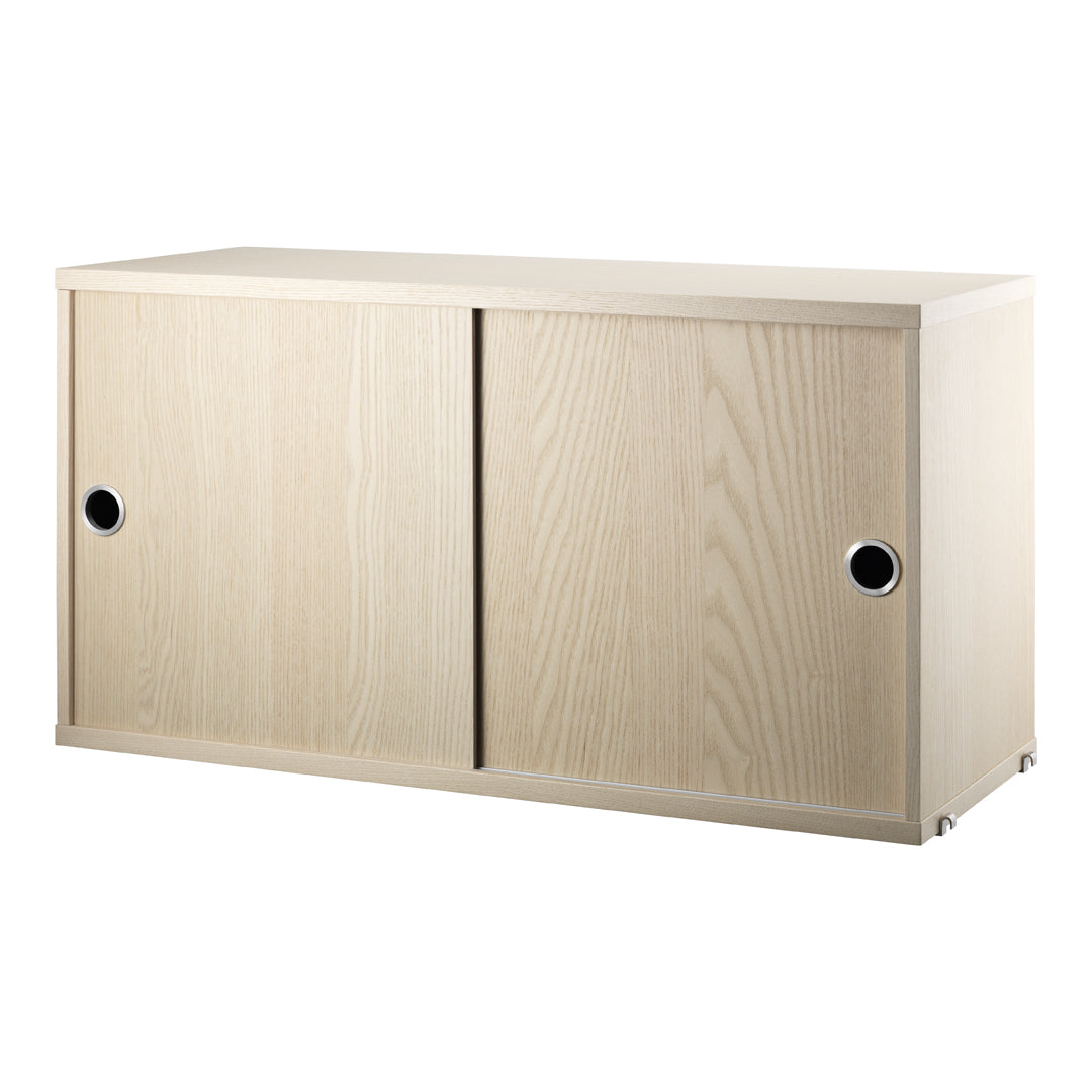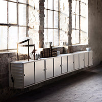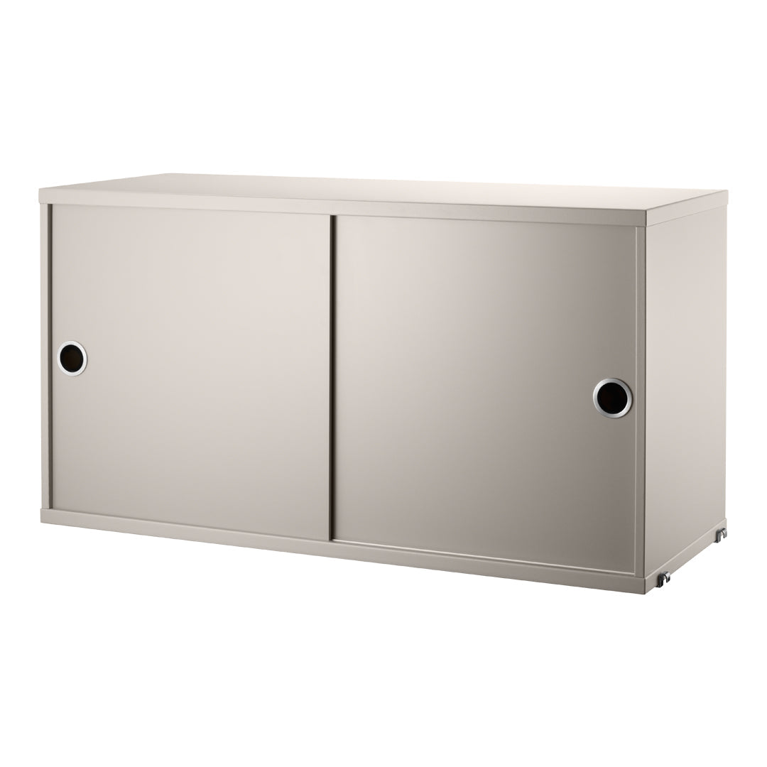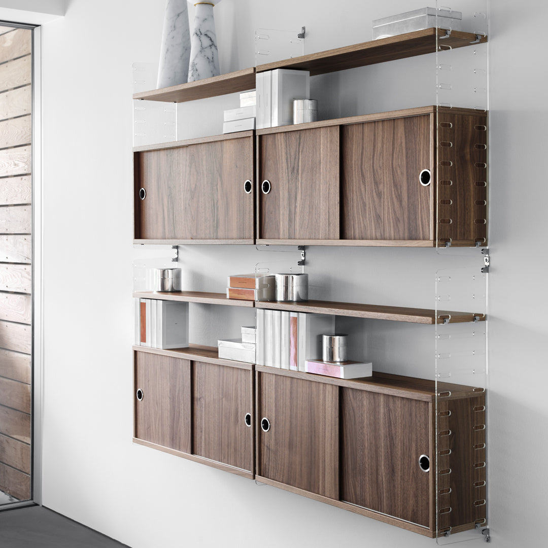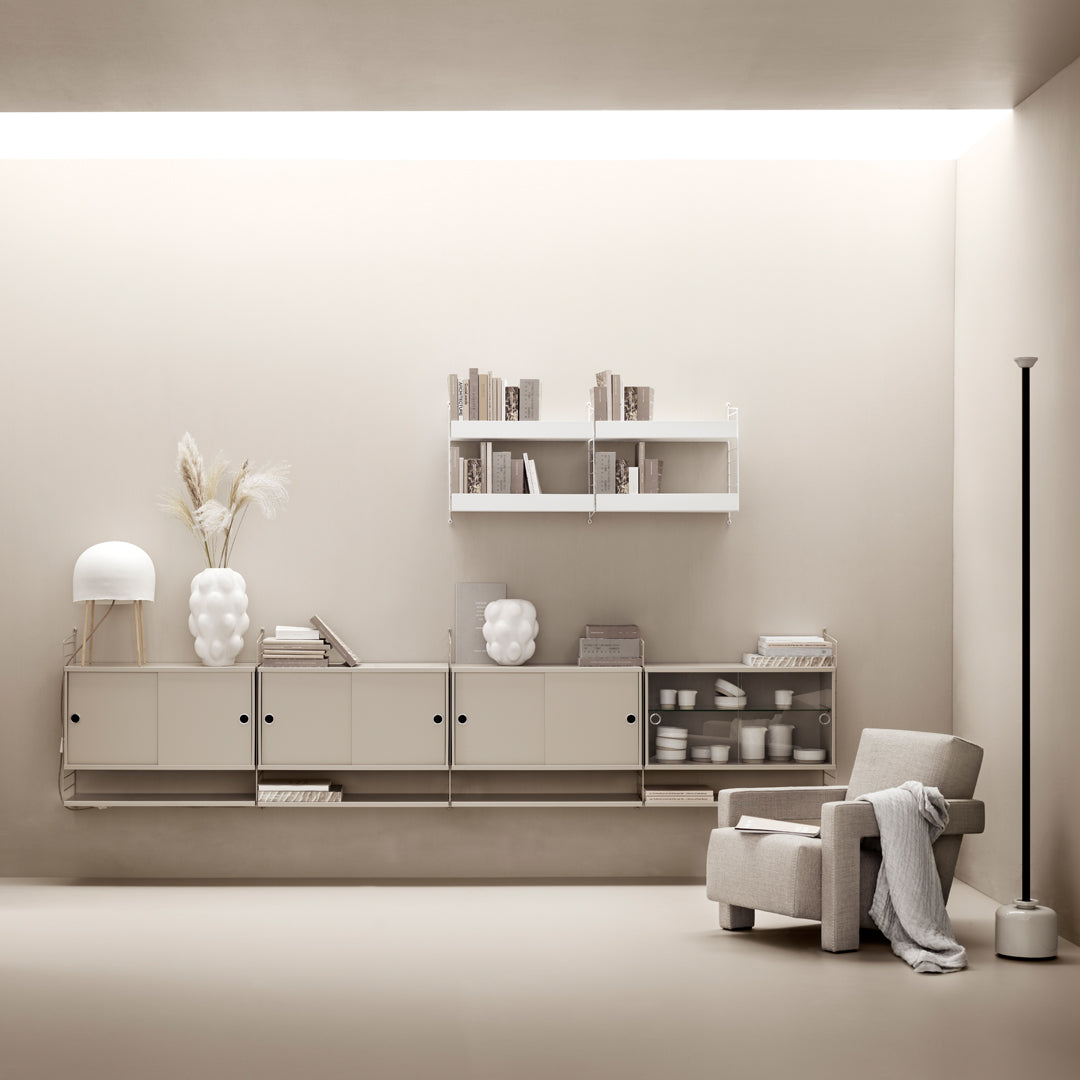 The cabinets with sliding doors are available in one width, 78 cm, along with two depths, 20 and 30 cm. The cabinets fit into all wire and plex panels from String® System. It is visually pleasing to add a bolder element to your shelf, like a cabinet, which also give you a lot of extra storage. The cabinet consists of one divider placed in the middle along with two adjustable inner shelves. The cabinet’s inner dimensions are 4 cm less than the outer dimensions. The cabinets are delivered unassembled.