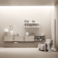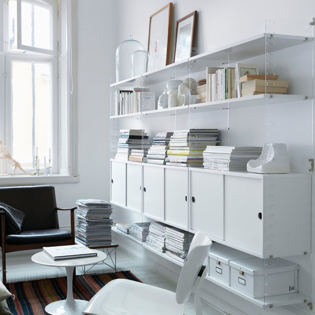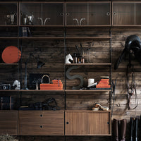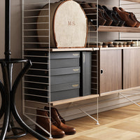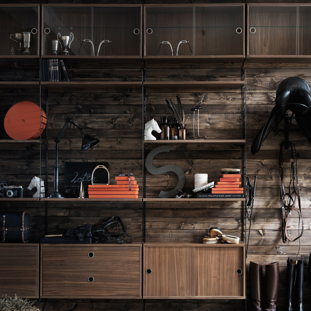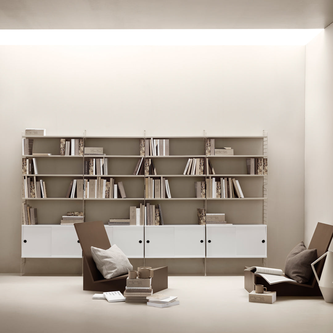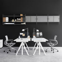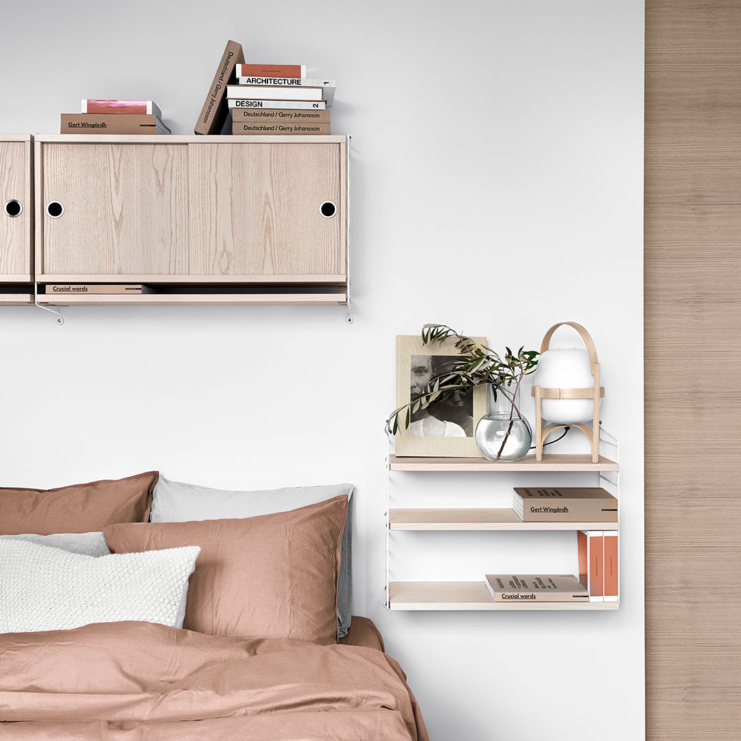The cabinets with sliding doors are available in one width, 78 cm, along with two depths, 20 and 30 cm. The cabinets fit into all wire and plex panels from String® System. It is visually pleasing to add a bolder element to your shelf, like a cabinet, which also give you a lot of extra storage. The cabinet consists of one divider placed in the middle along with two adjustable inner shelves. The cabinet’s inner dimensions are 4 cm less than the outer dimensions. The cabinets are delivered unassembled.