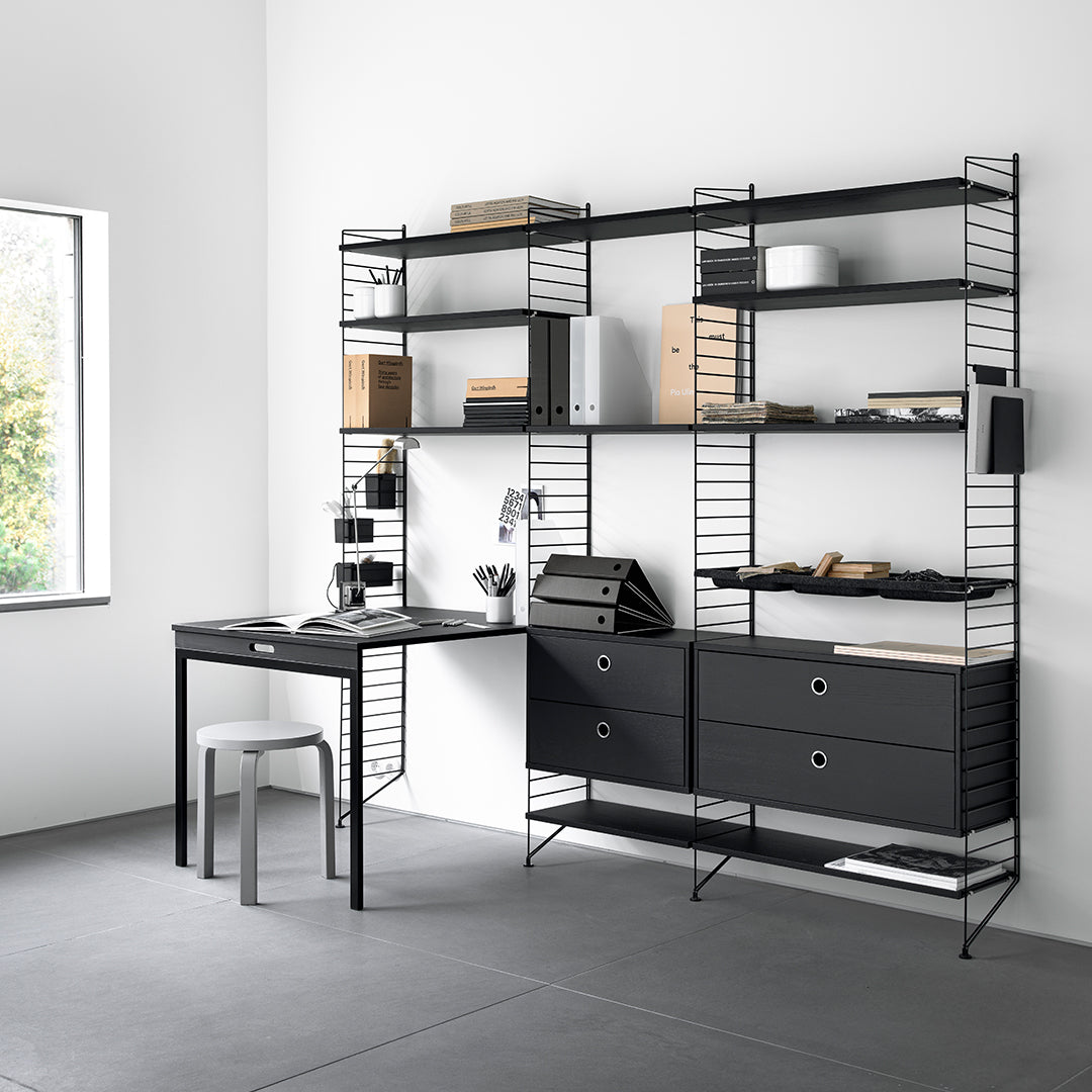 The magazine holder fits together with 20 and 30 cm deep wire panels from String® System. The magazine holder is design to increase functionality and to inspire new and creative storage solutions. Add it to your kitchen shelf to keep your food magazines in one place or add it to your living room combination to always have close proximity to your book when relaxing in your reading corner.