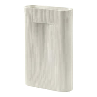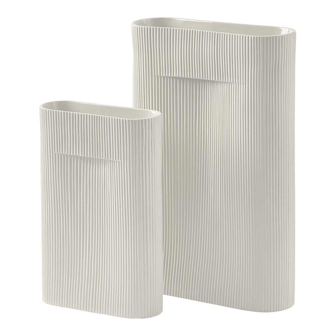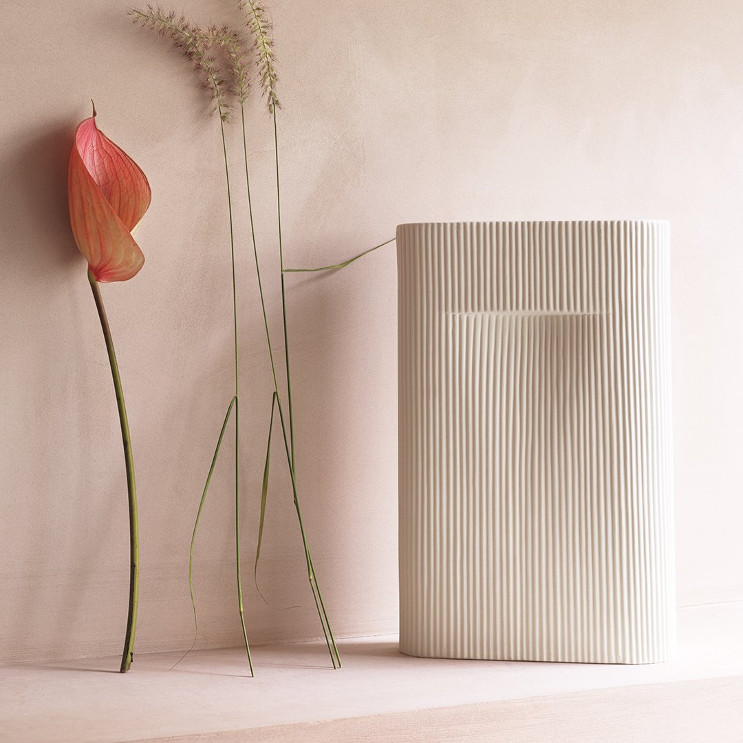 "The idea for the Ridge Vase came while traveling through different cities with a vase in mind, searching for details that had an architectural feel. Upon returning to our studio in Finland, we began sketching by hand and making mock-ups in paper and ceramics. With its vertical lines and unique shape, inspired by a doorway in Paris, the Ridge Vase presents a new way to place flowers through a modern expression along with a sculptural character when not in use. The Ridge Vase manipulates the oval form through its refined dent while adding the function of a small handle to use when moving the vase form one room to another." - Salla Luhtasela & Wesley Walters of Studio Kaksikko