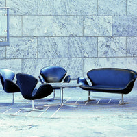 The Swan sofa was made as a special model for the furnishing of suites, lounges and the panoramic restaurant at the SAS hotel in 1958. The sofa was in production from 1964-1974 and was reintroduced in 2000. The characteristic 3-dimensional shape contains no straight lines but is based on curves like the Egg and the Swan. It is available in a variety of fabric upholstery as well as exclusive leather types. The sofa rests on a shaker base in satin polished aluminum.