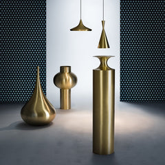 A group of floor vessels in three unique shapes. Made from brass, the Beat Vessels are spun and welded in separate parts to create their form.