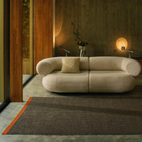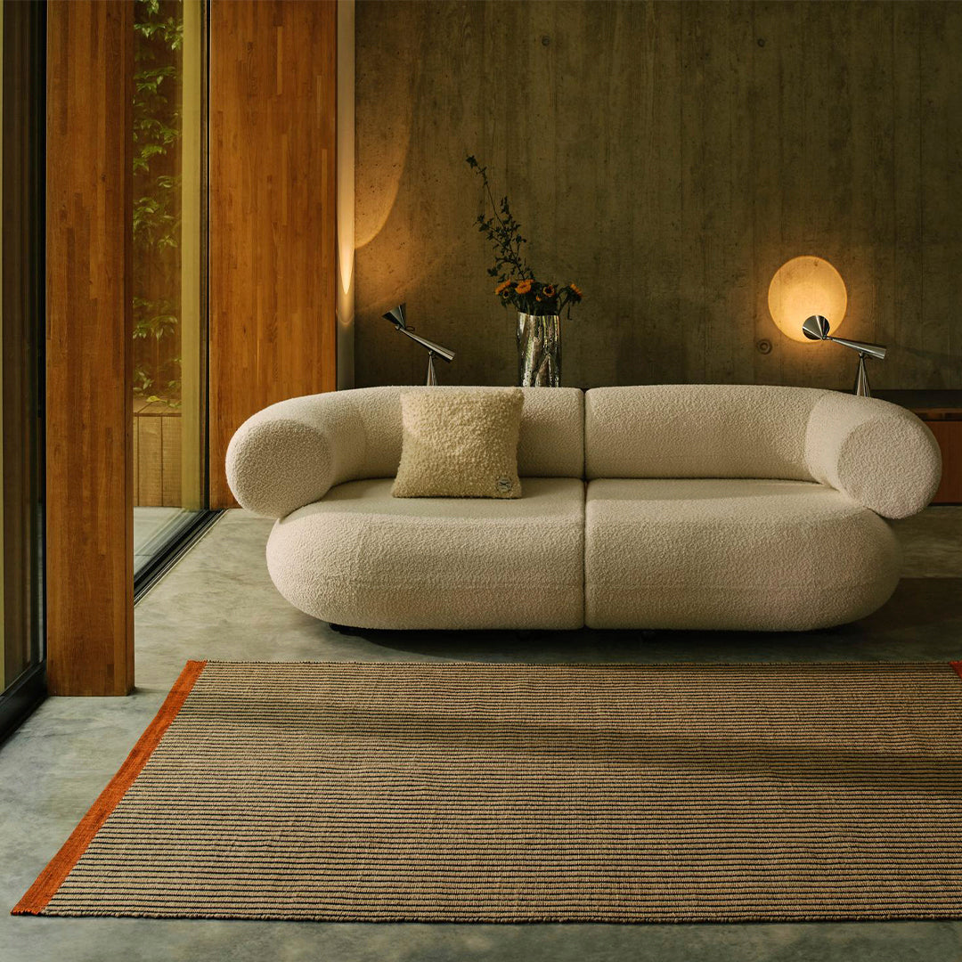The line rug is constructed out of a striking reversible mixed yarn flat weave offering versatility and style. The contrasting orange woven band adds a vibrant pop of color, while the tiger-inspired black stripes give it a striking, dynamic look. Available in two sizes, the line rug is suitable for a variety of spaces whether to enhance a small space or make a statement in a larger room.