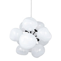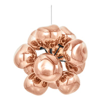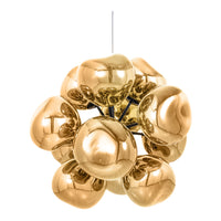 Melt is evocative of molten glass, the interior of a melting glacier or images of deep space. An imperfect, organic and naturalistic light that produces a mesmerizing hot-blown glass effect. Melt is created through a process of blow molding and vacuum metallization to achieve melted orbs with abundant and unusual luminosity. Melt Burst Chandelier features twelve orbs protruding from steel tubes.