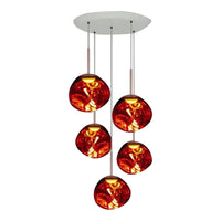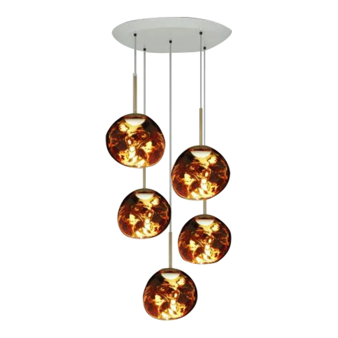 An extraordinary chandelier featuring five Melt Mini ceiling lights. Featuring our integrated LED module, this ceiling light creates a mesmerizing melting hot-blown glass effect when on and a mirror-finish effect when off. Made in Germany using a high tech manufacturing technique to achieve the perfect melted orb.