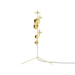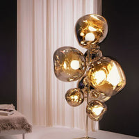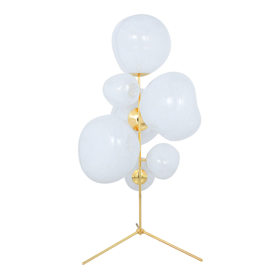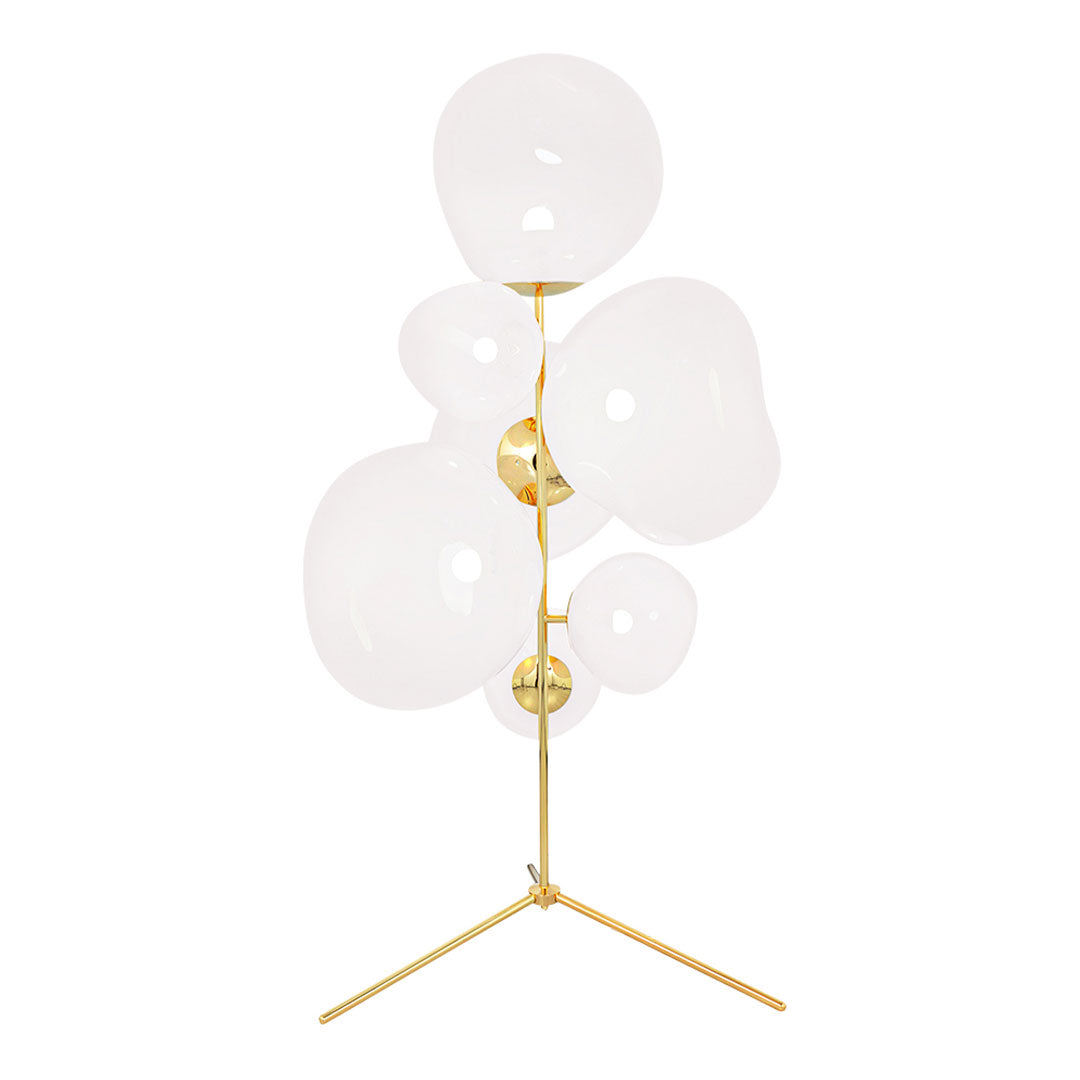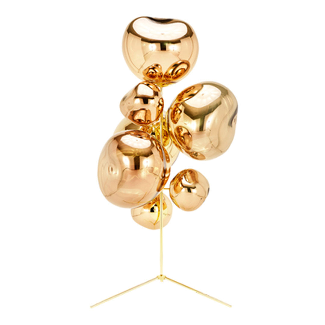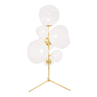 An extraordinary floor chandelier, featuring three Melt Mini shades and four Melt shades in a modern gold finish. Emitting an attractive, mildly hallucinogenic light, this floor light creates a mesmerizing melting hot-blown glass effect when on and a mirror-finish effect when off. Made in Germany using a high tech manufacturing technique to achieve the perfect melted orb.