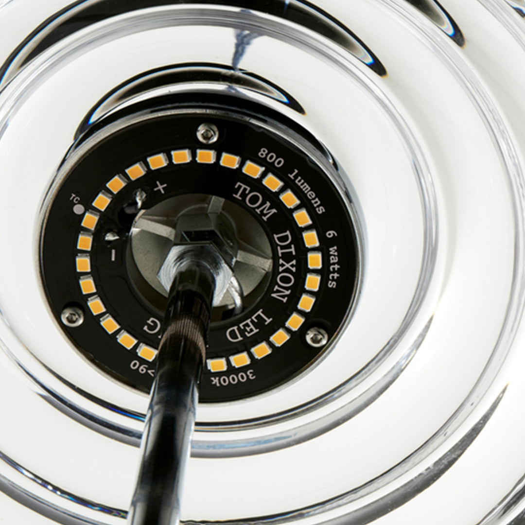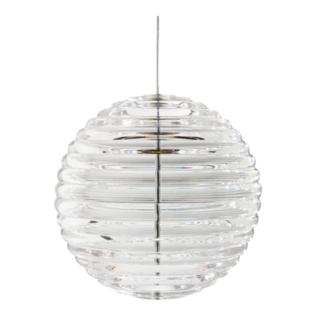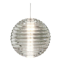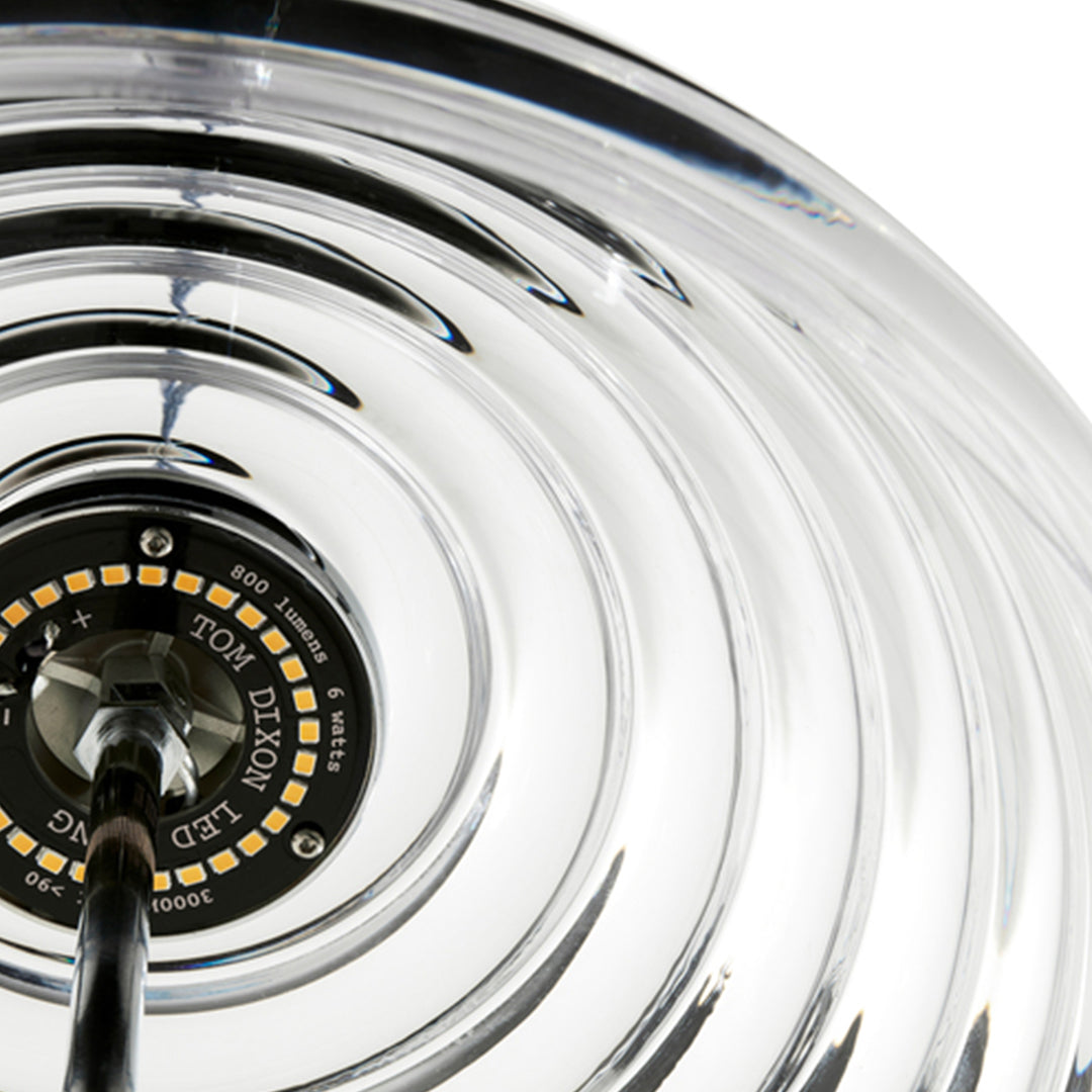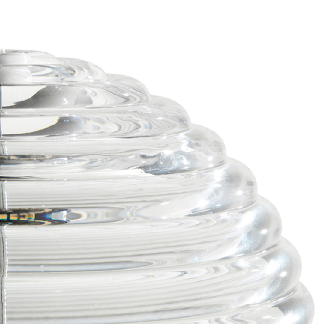 Press is made of fat, chunky coils of pure and clear glass, pressed in iron molds under tons of pressure to create heavyweight grooved glass artefacts. Bold in silhouette and simple in function, the ribbed glass of Press lights refracts and diffuses the interior light source from the integrated LED and projects linear and stripy patterns across its surroundings.