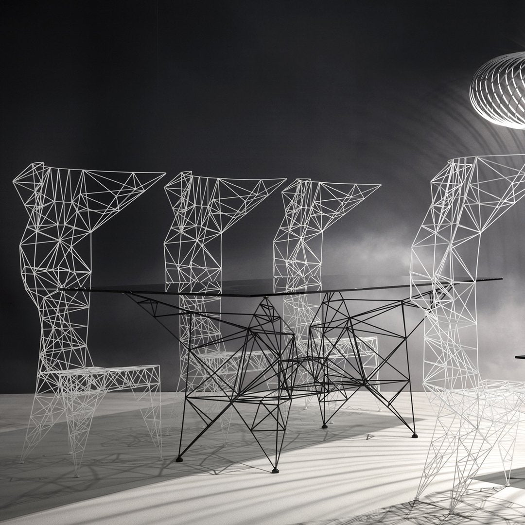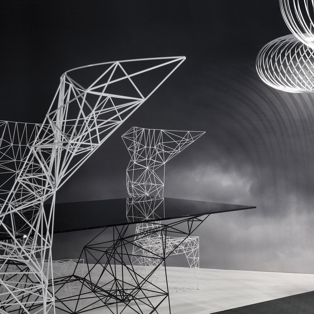 Originally created on a self-propelled mission to design the world's lightest metal chair, Pylon was made in a small series in Dixon's metalwork shop in the early 90s. The lattice work of 3mm diameter steel rod is triangulated for maximum strength - an exercise in pure unadorned structure.