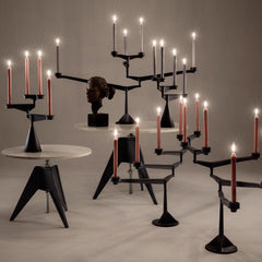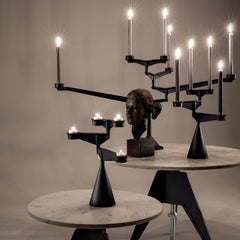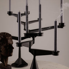 A rugged and sculptural kinetic candelabra made from cast iron, machined and finished entirely in Great Britain. A (literal) revolution in candlesticks, the design takes its inspiration from the heavy machinery of the industrial revolution, whilst maintaining a balanced elegance. Its four arms swing around on their own axis, allowing for infinite configurations. The five sockets can hold tea lights or standard candles.