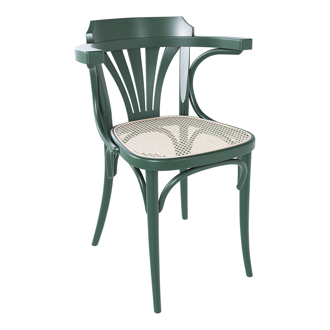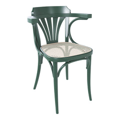 A traditional carver chair with a distinctive fan backrest. The plywood seat can be accessorised with a relief, or the upholstered version with decorative studs. A cane weave is another option.