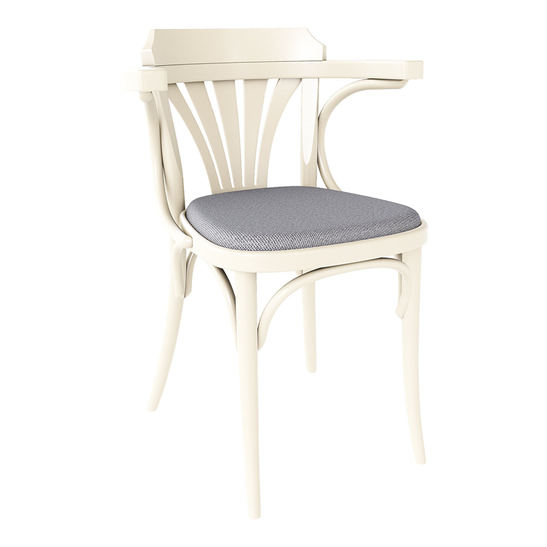 This traditional armchair has a characteristic fan filling the backrest. The plywood seat can be upgraded with a relief and the upholstered version with decorative studs framing the seat and top part of the backrest.