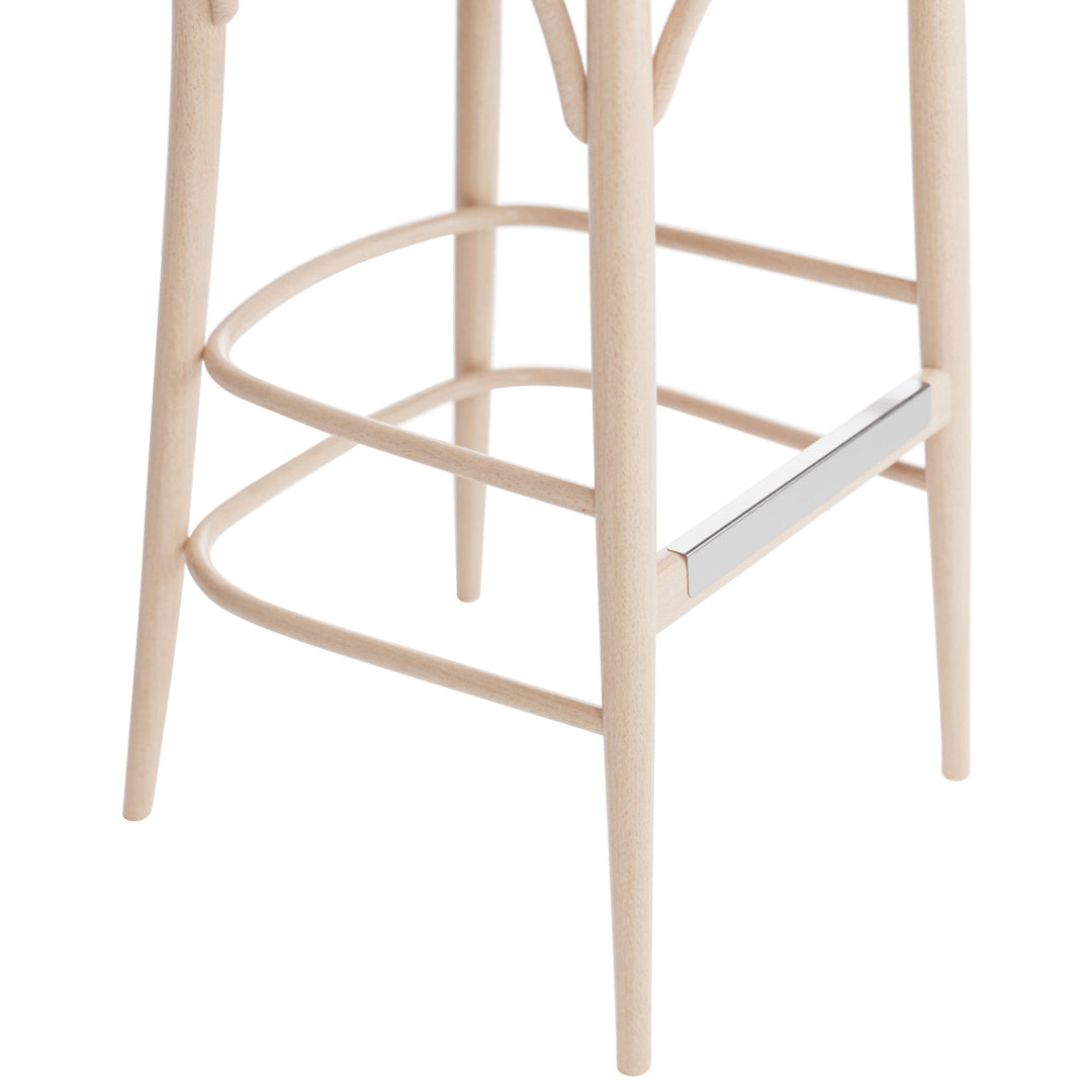 A barstool of the Banana model got its name from a banana-shaped plywood backrest. The rest of its frame is based on the technology of manual bending of beech logs.