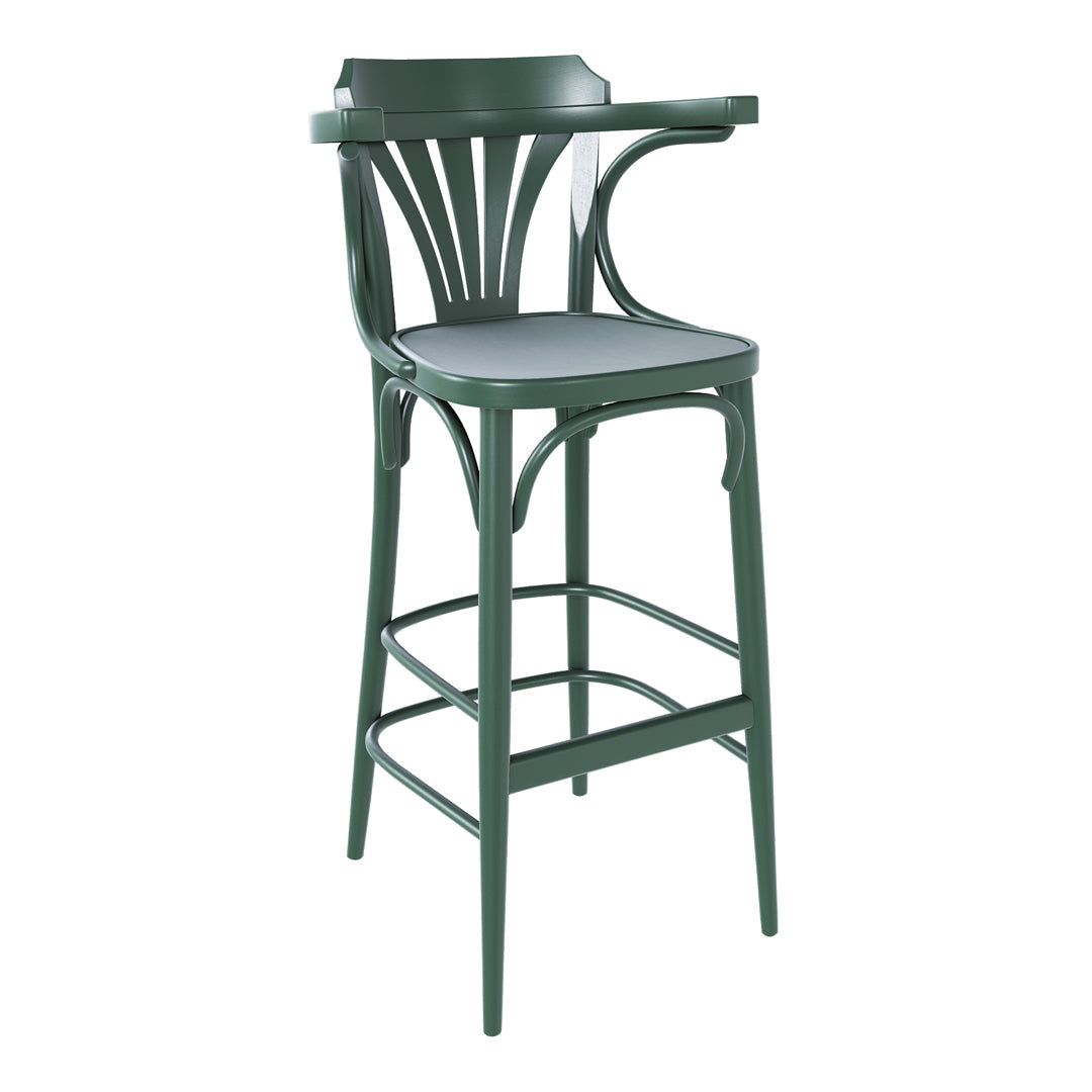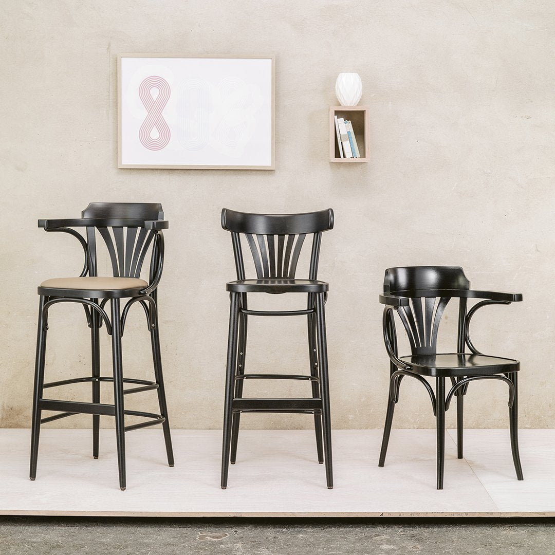 This barstool with armrests has a typical plywood fan filling the backrest. The upholstered version can be decorated with studs and the seat with relief plywood. To prevent damages a protective sheet can be placed on the front leg joint.