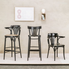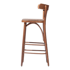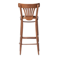 This barstool is based on model No. 56. Its distinct feature is the plywood fan filling the backrest. The upholstered version can be upgraded with decorative studs framing the seat and the top of the backrest.