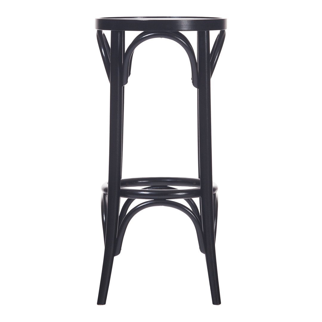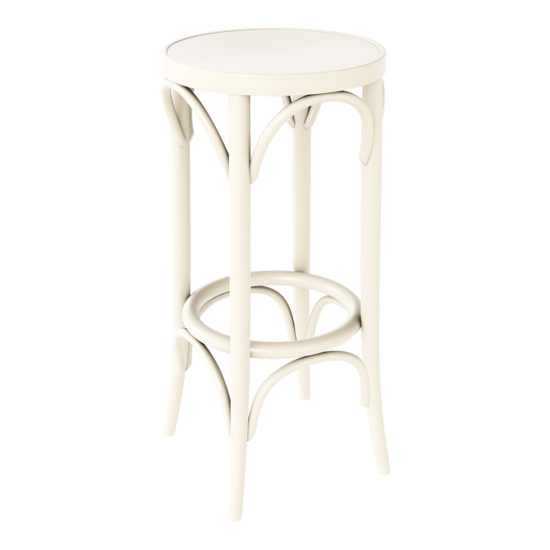 This barstool without a backrest is decorated with eight manually bent beech leg joints, which are the distinctive feature of its classical look. The seat can be upholstered and/or enhanced with decorative studs.