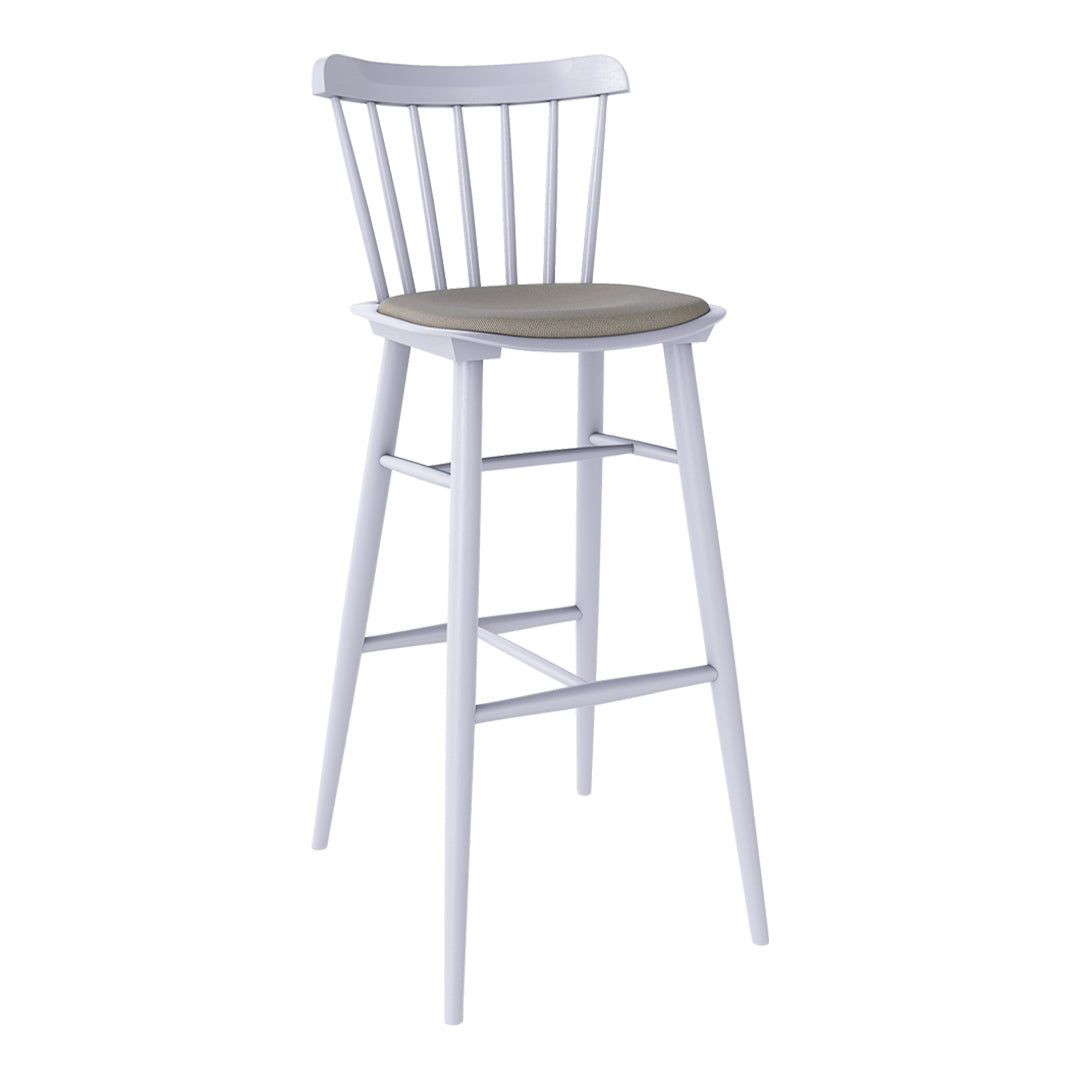 The barstool from the Ironica series is characterised by the same form as its namesake chair. The barstool is made with seven hand-finished dowels to hold the rounded backrest and is available in low and standard heights.