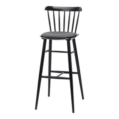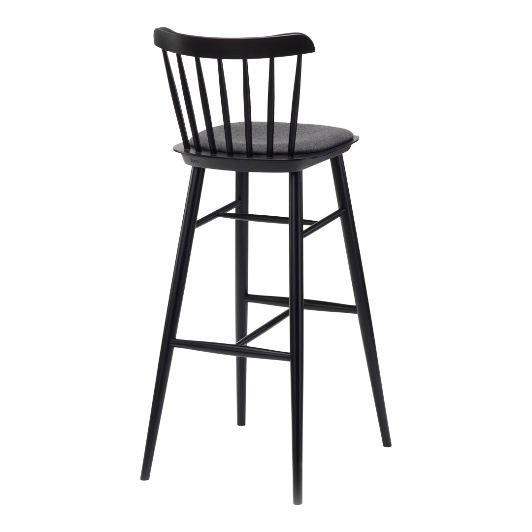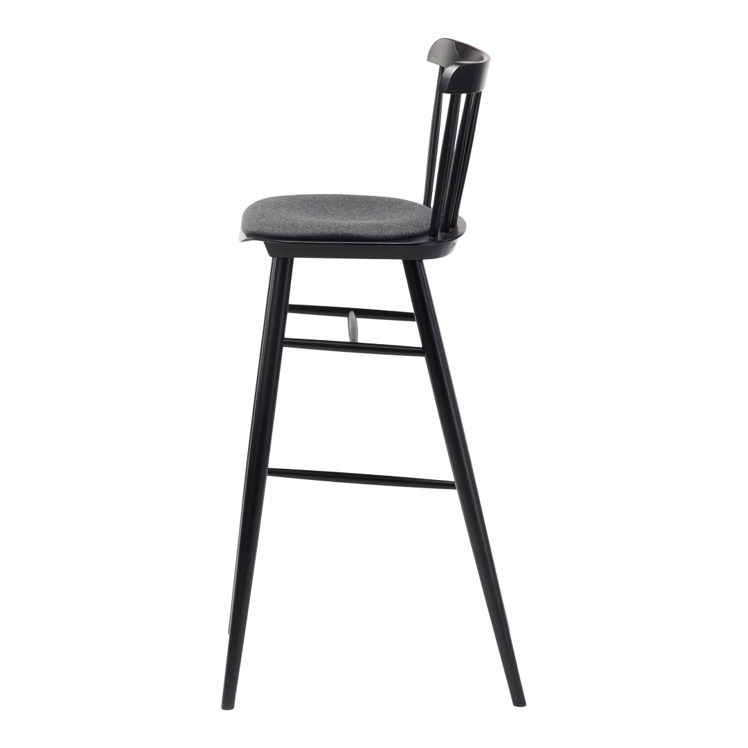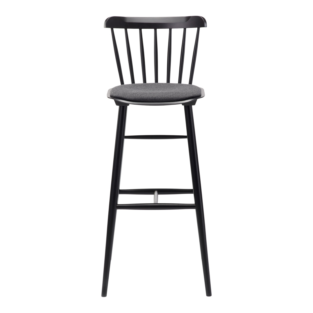 The barstool from the Ironica series is characterised by the same form as its namesake chair. The barstool is made with seven hand-finished dowels to hold the rounded backrest and is available in low and standard heights.
