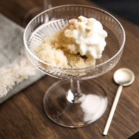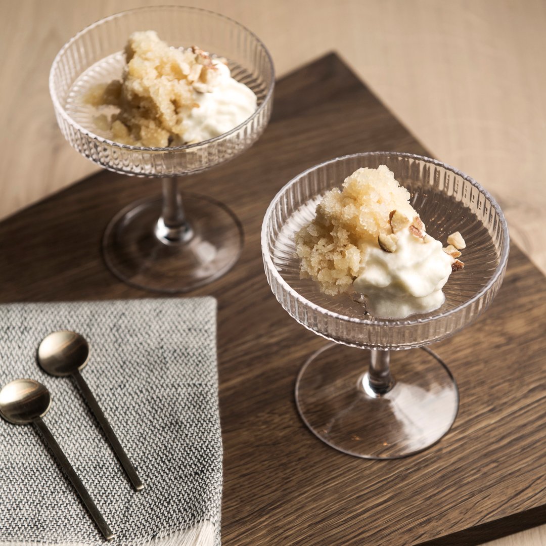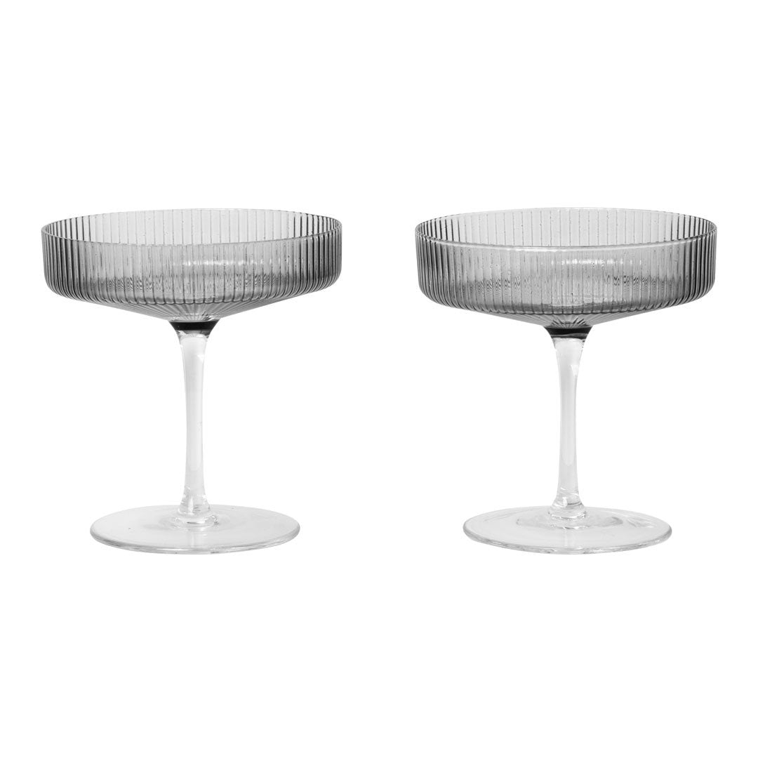 Featuring a beautifully rippled surface this set of champagne saucers presents a classic glass for sparkling wines. They are made of delicate glass mouth-blown into the mould, adding a dynamic and energetic expression to the glasses. Every glass is mouth-blown and made with love, so variations can occur
