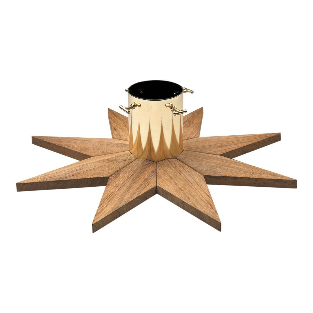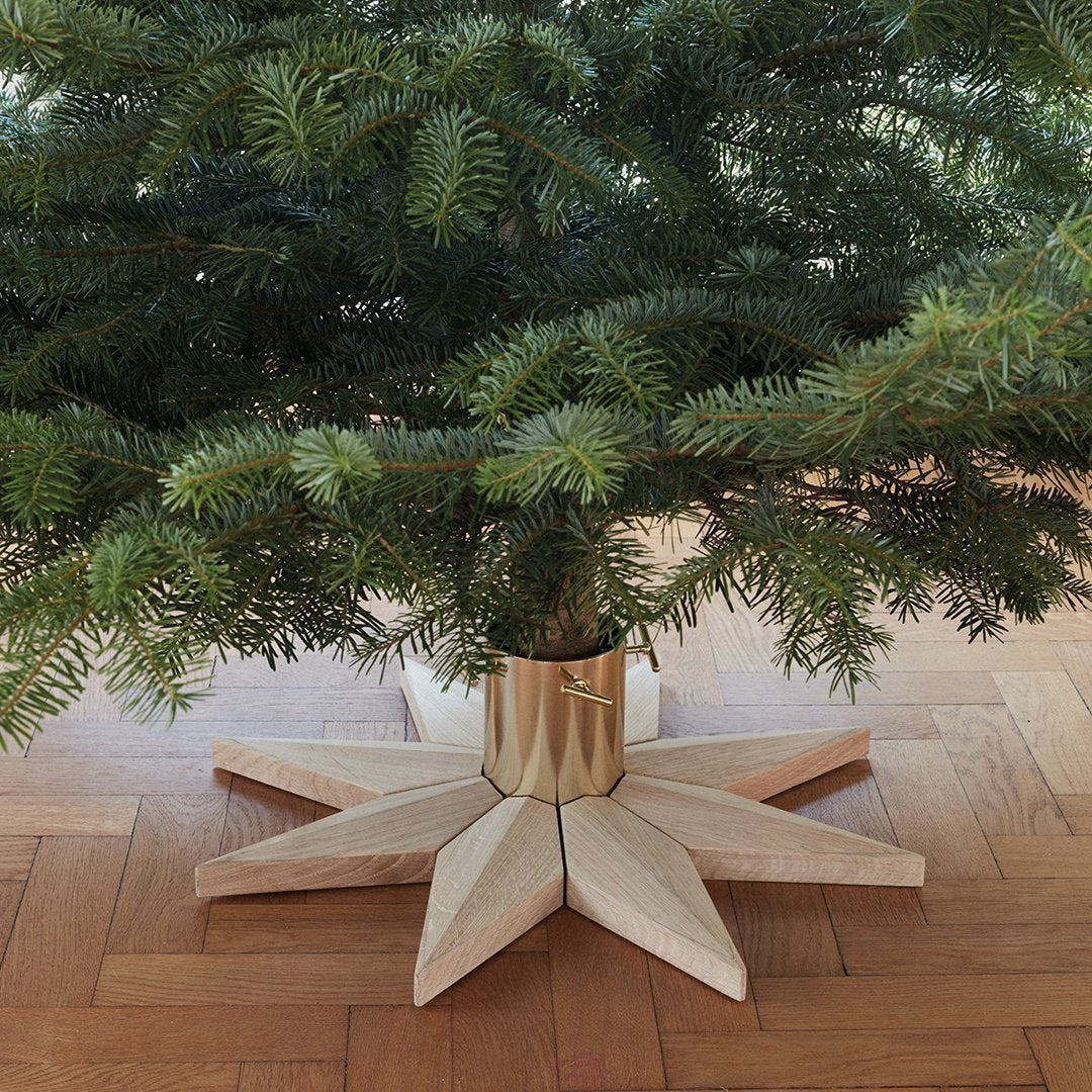 An eight-point star sits at the base of the tree, radiating from a gilt cup. Inside the cup, a spike skewers the tree trunk, which is also held in place with screws. The cup can be filled with water to keep your Christmas tree from drying out.