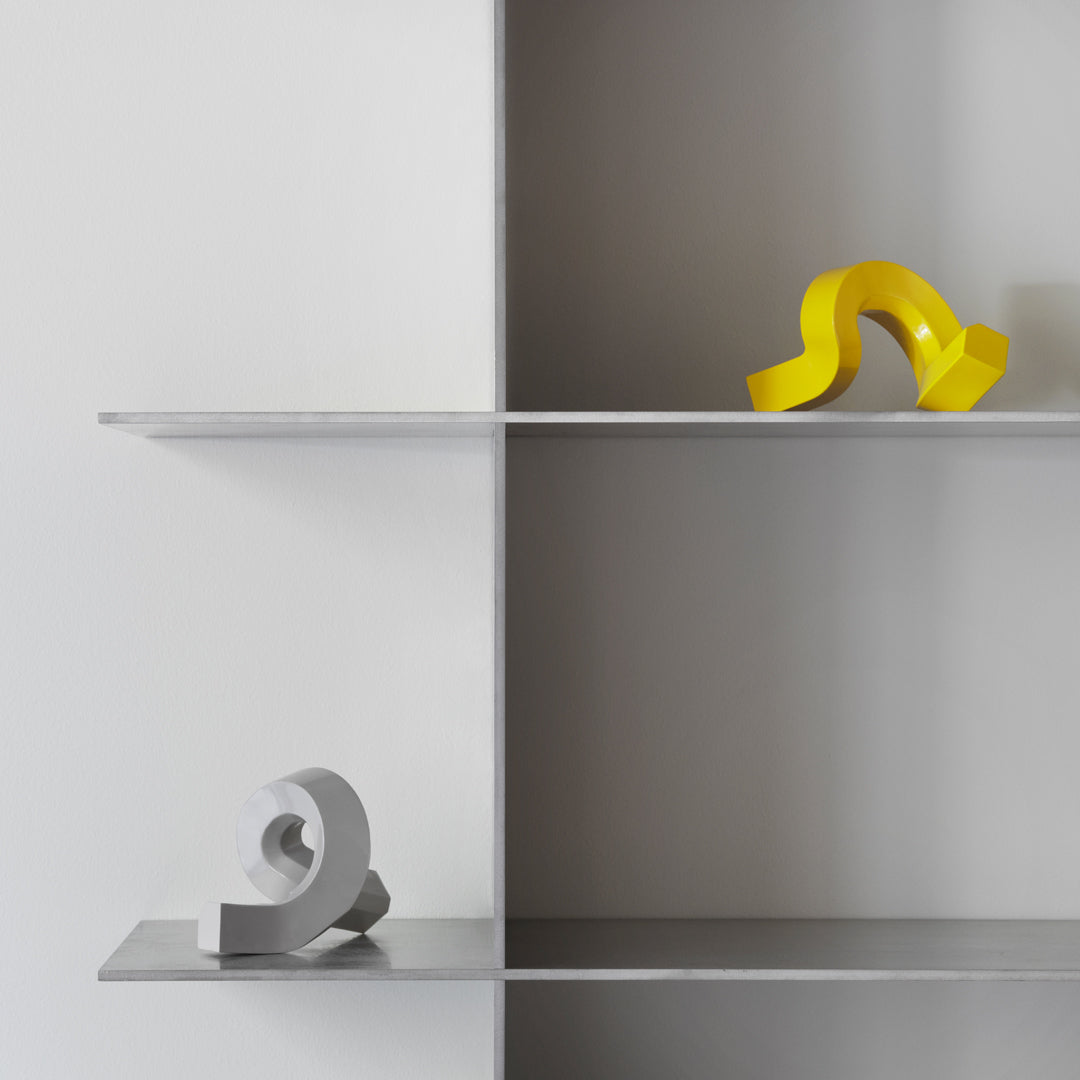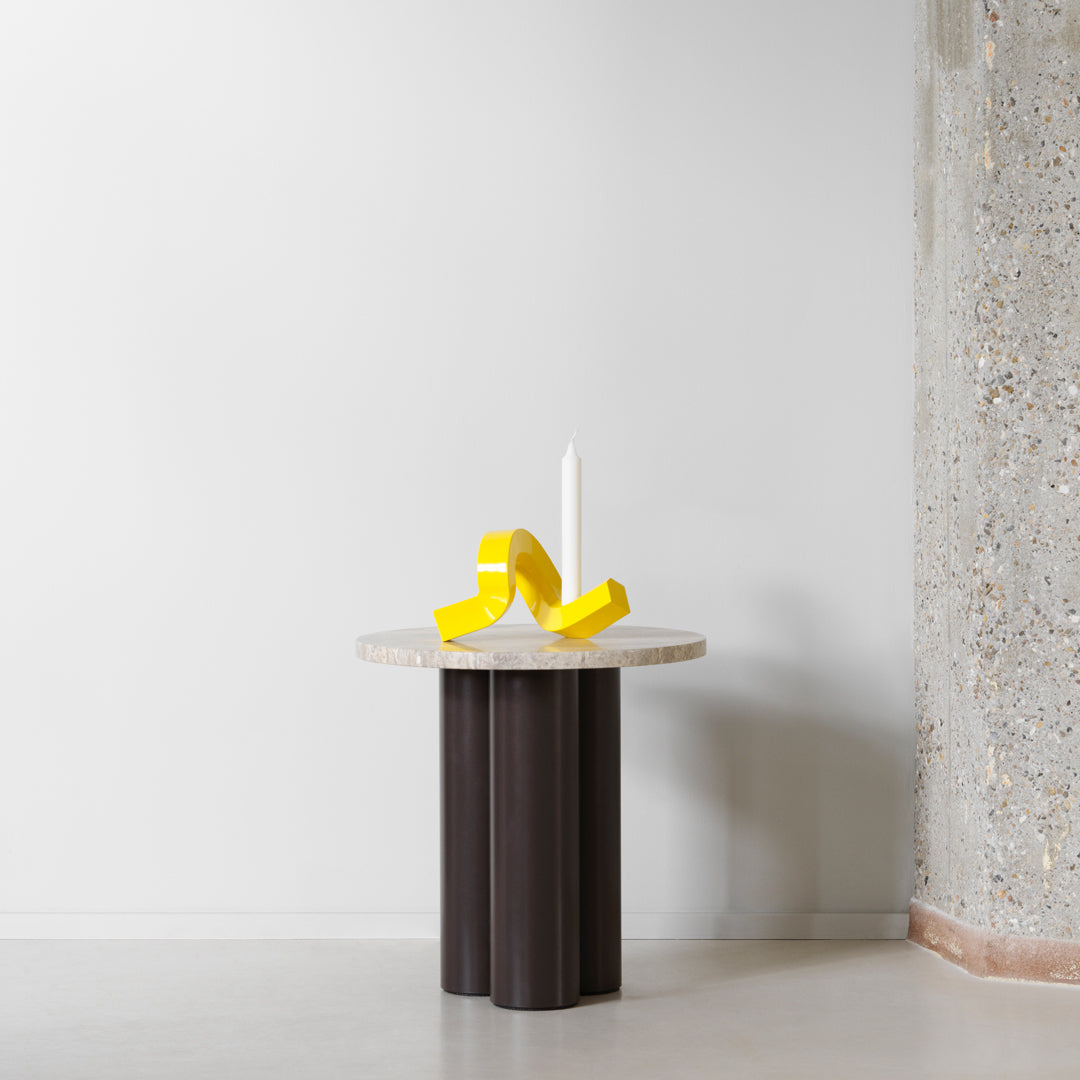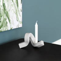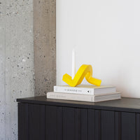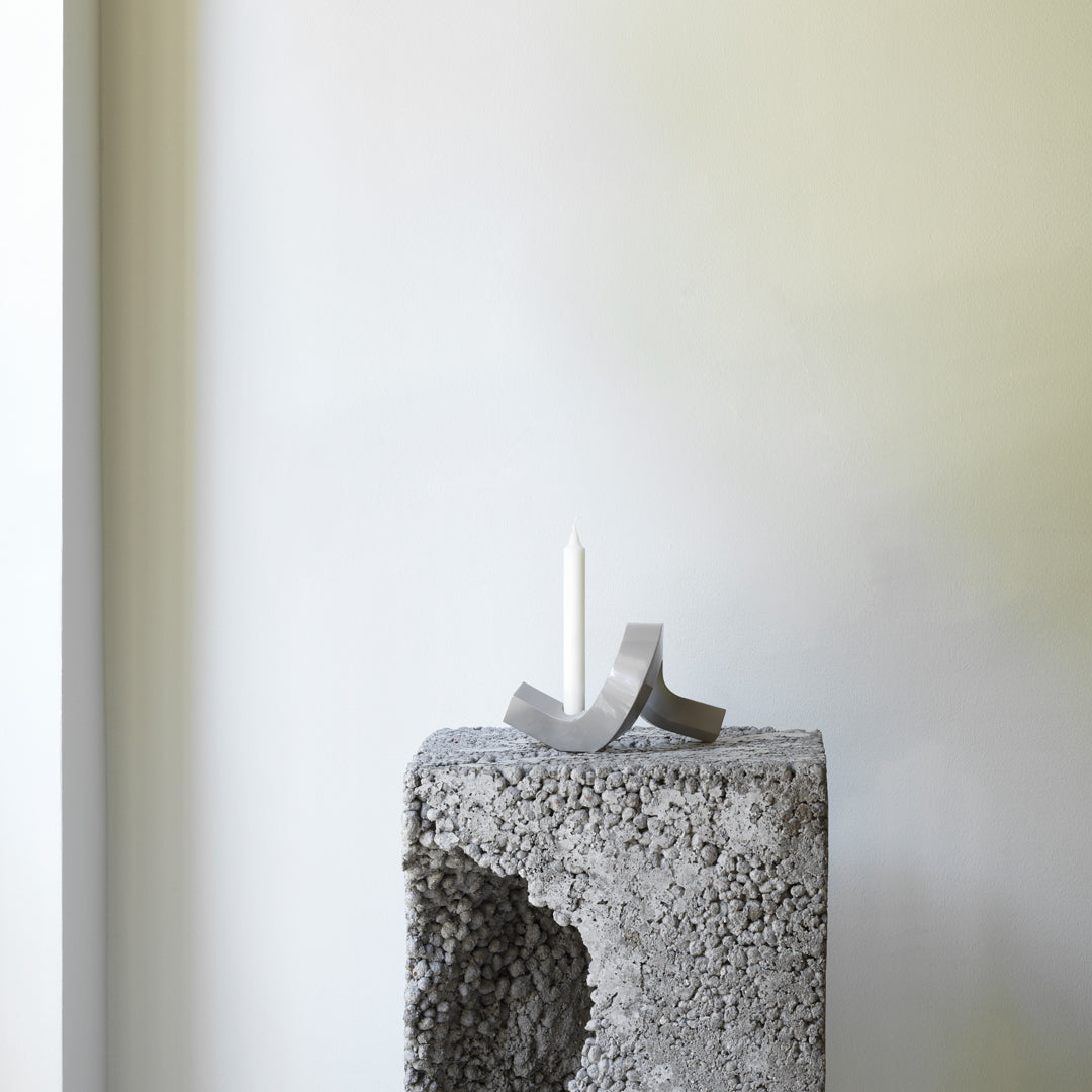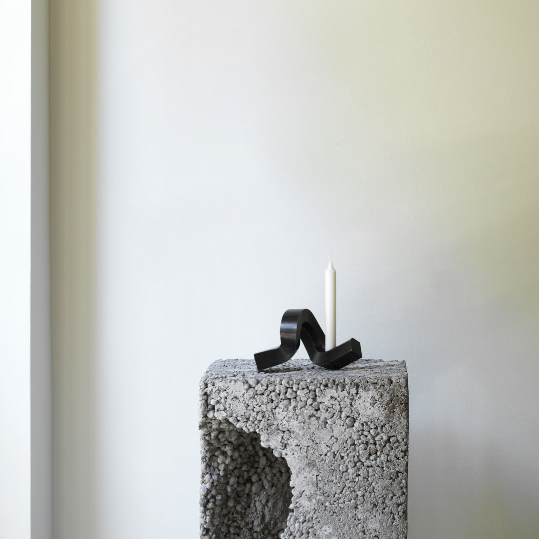 Crooked is a candlestick and decorative sculpture in one. A tribute to the designers love of "crooked" characters, Crooked draws inspiration from the intersection of design, art and architecture. Crooked Candlestick comes in two versions with room for either one or two candles, and in either painted aluminum or bronzed brass.