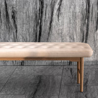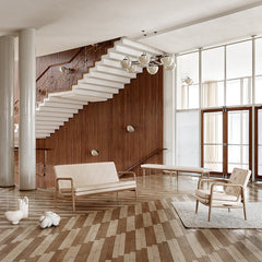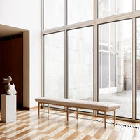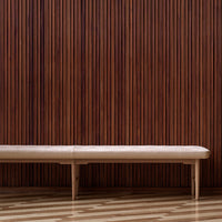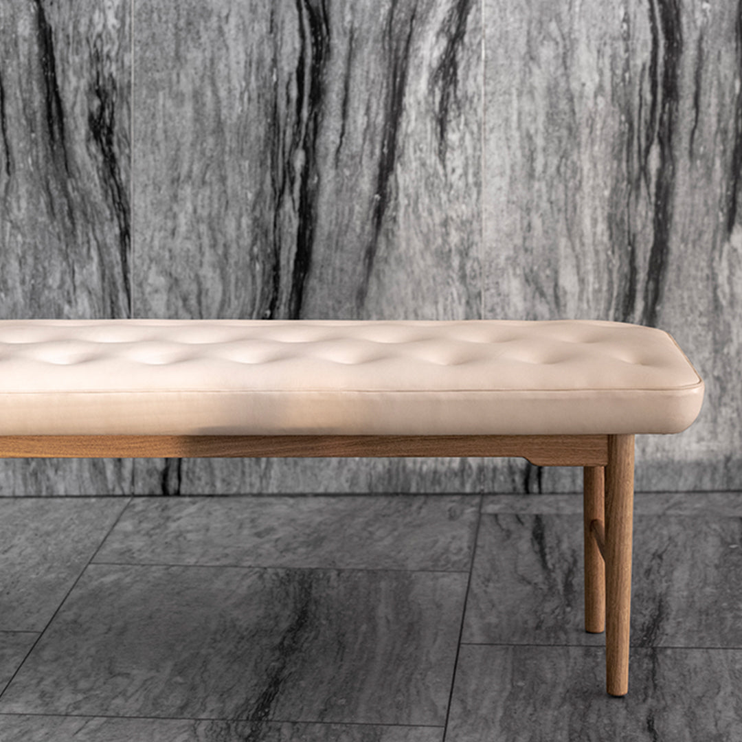 One of three furniture pieces created in 1945 by Vilhelm Lauritzen, the Foyer Bench was initially designed for Copenhagen’s Radiohuset, which today houses the Royal Danish Academy of Music. Simple in its expression, the bench holds an upholstered cushion with handmade buttons on its solid oak frame. Adapted in length and comfort to present-day needs, the beauty of its original design remains now and for generations to come.