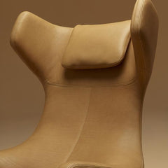 A synchronized mechanism is concealed beneath the upholstery of the Grand Repos wing chair and can be locked in any position, for optimum back support and utmost comfort at any reclining angle. The characteristic head section invites the user to lean back and creates a sense of shelter and seclusion. The decorative seams in the fabric or leather upholstery lend the armchair an almost artisanal look.