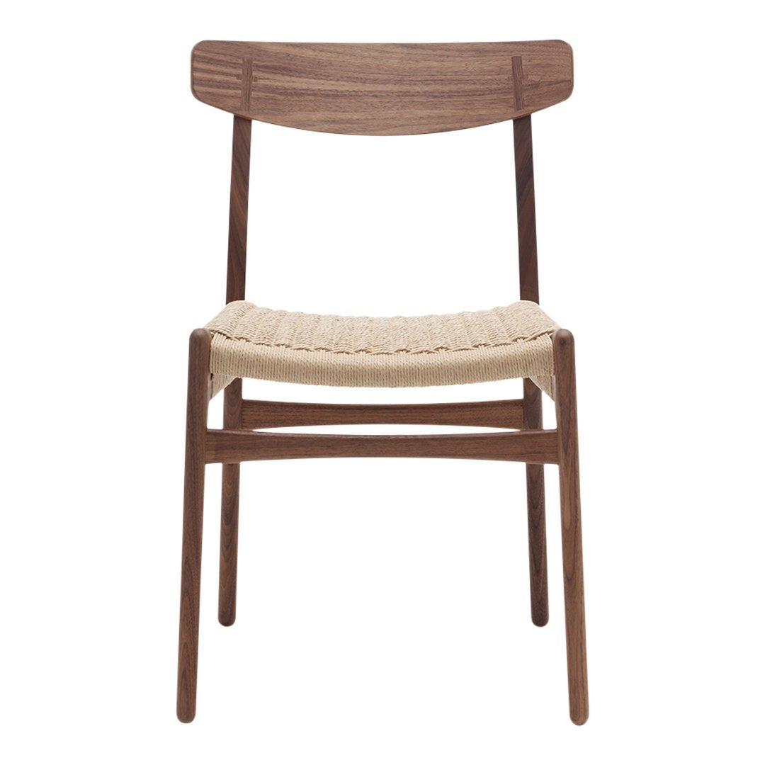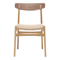 The CH23, which is produced in exact accordance with Hans J. Wegner's original hand drawing, is a simple chair notable for its fine, well-known Wegner details: elegant cruciform cover caps on the form-pressed veneer backrest, a double-woven paper cord seat, and rear legs that are arched to maximize stability - all examples of the master designer's sense of refined craftsmanship.
