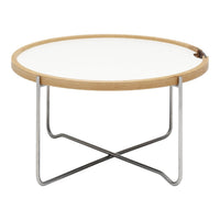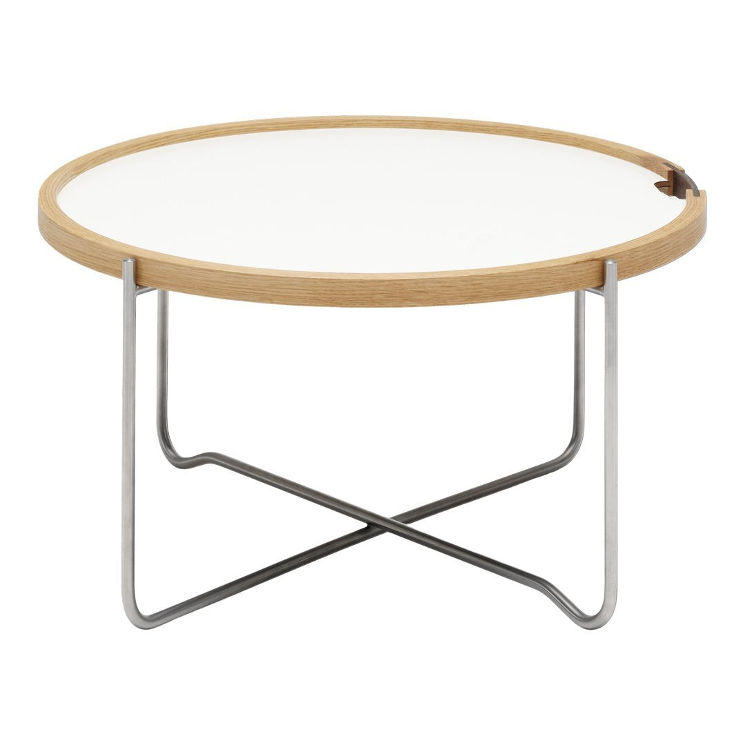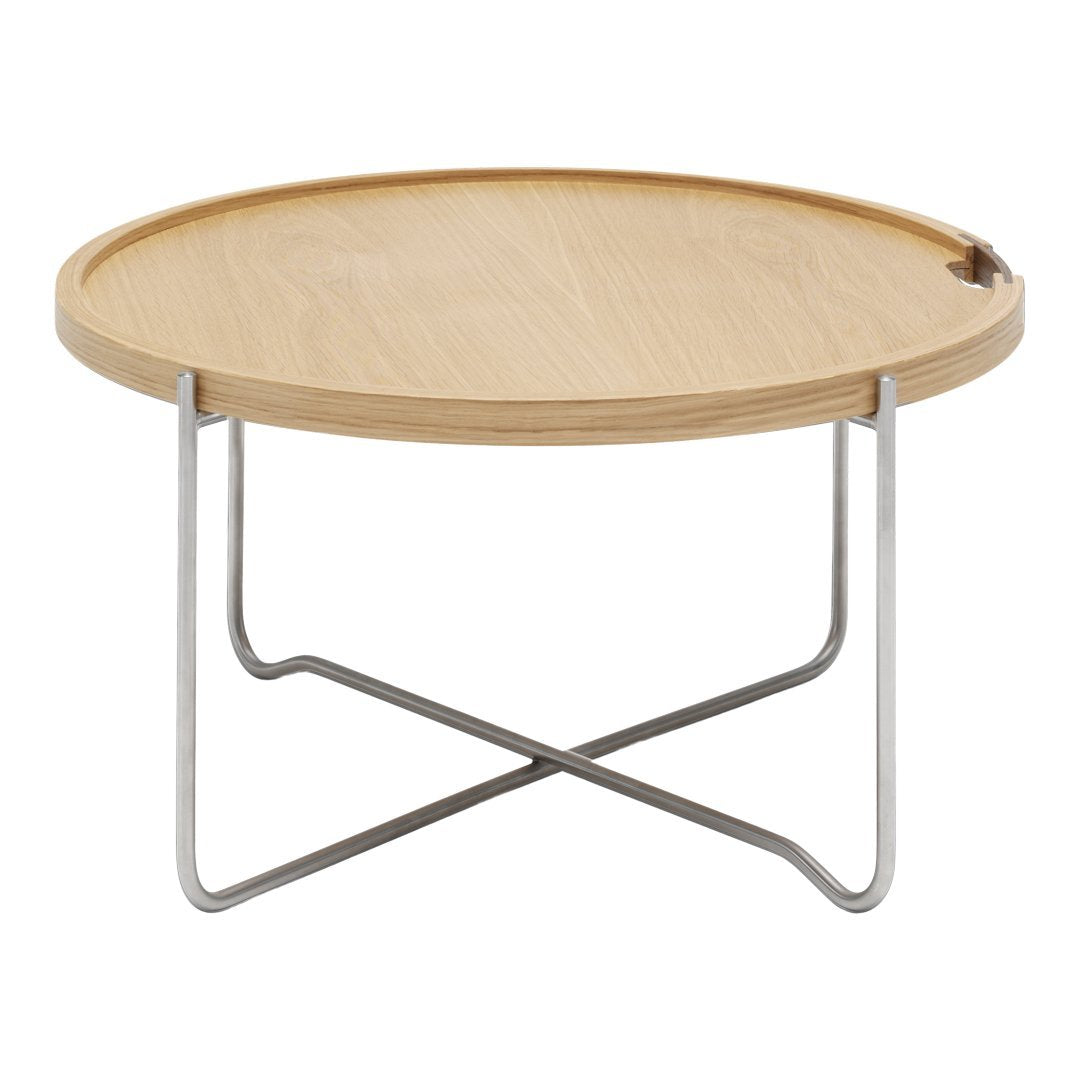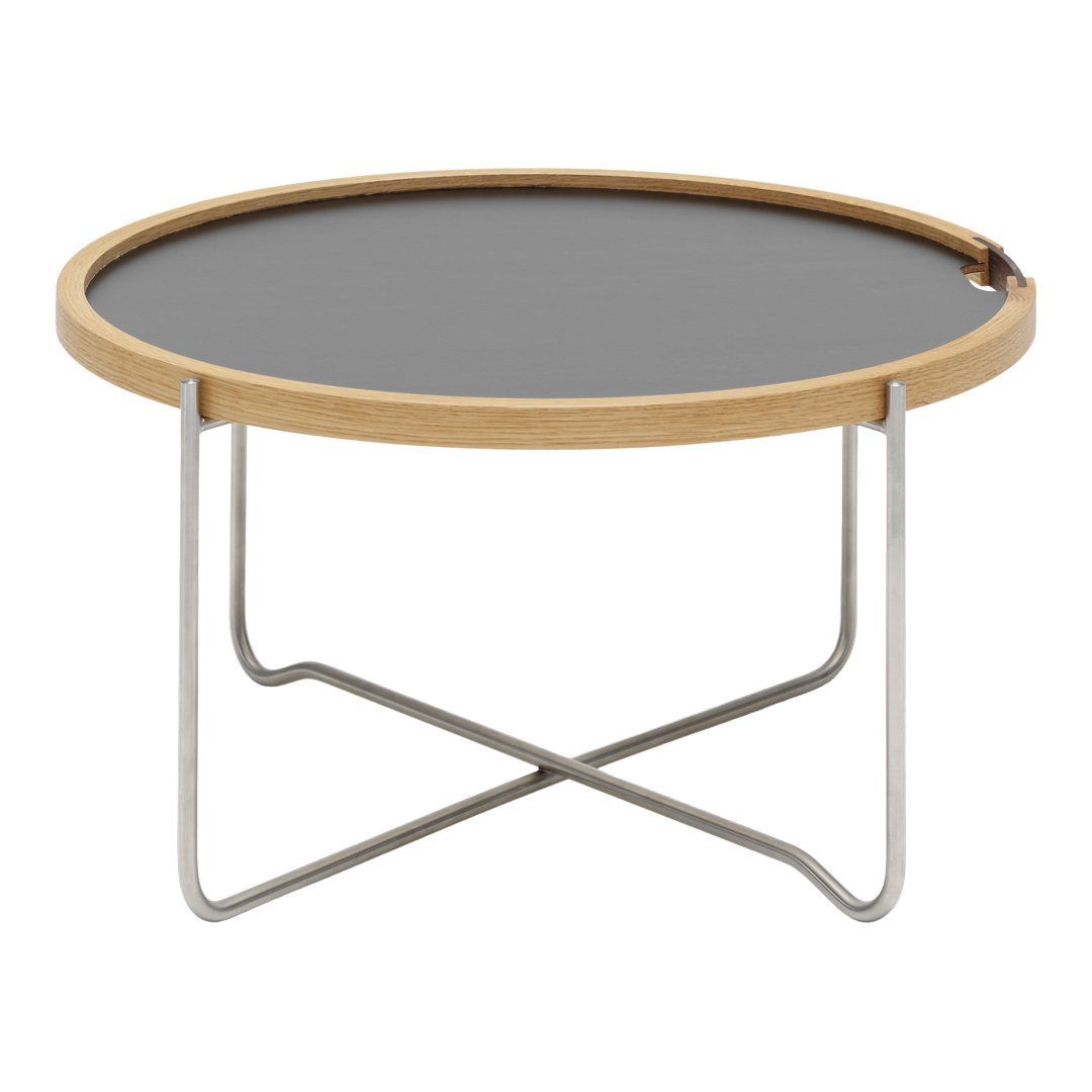 The CH417 is available with two different tray variants: one features white and black laminate surfaces, the other has veneer surfaces in light and smoked oak. In both variants, the tray rim is made of light oak and the handle of smoked oak. The base is stainless steel.