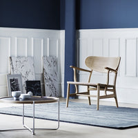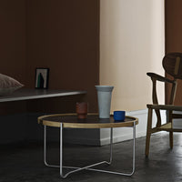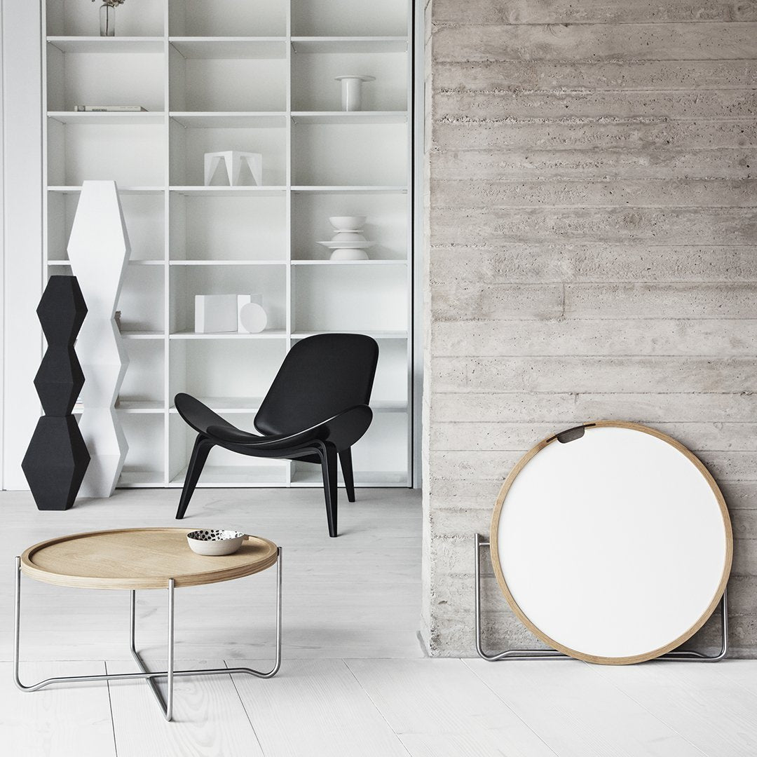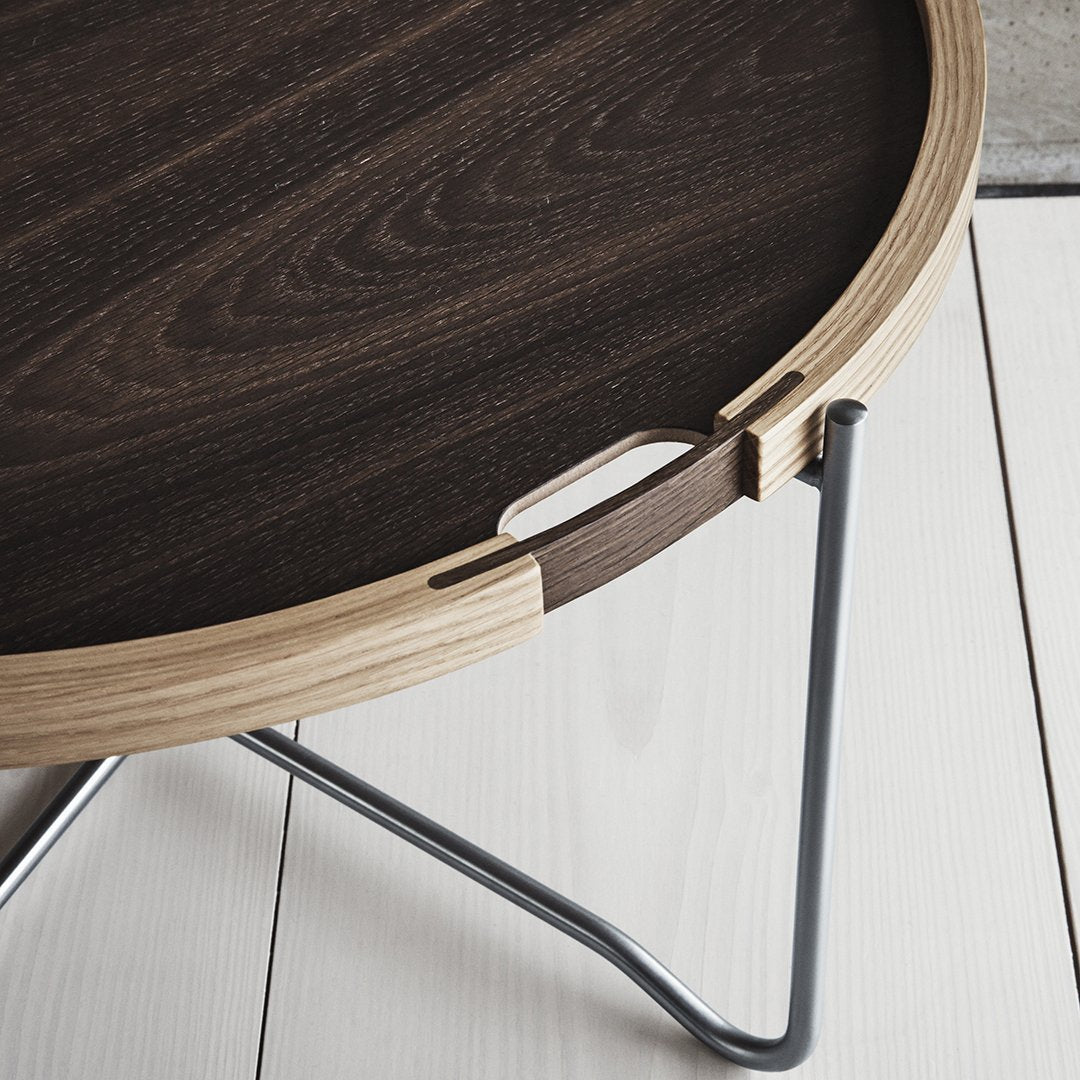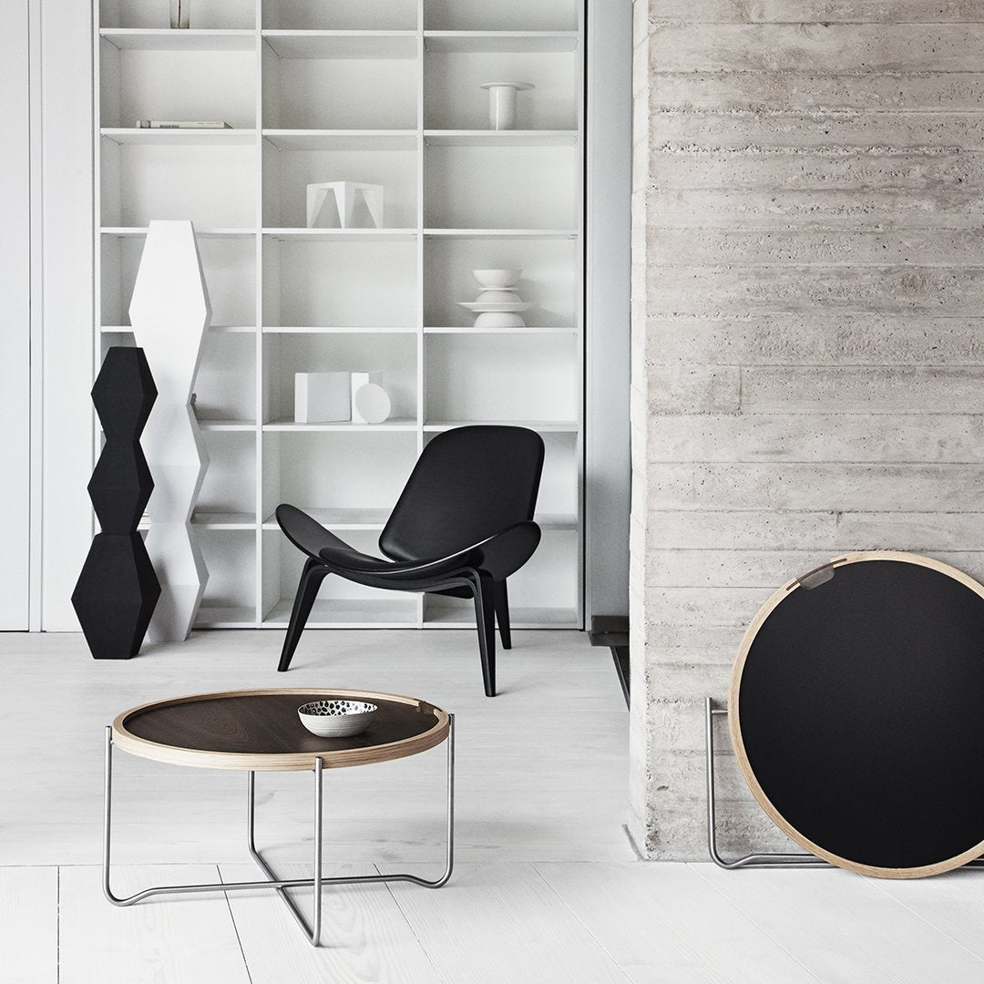 The CH417 is available with two different tray variants: one features white and black laminate surfaces, the other has veneer surfaces in light and smoked oak. In both variants, the tray rim is made of light oak and the handle of smoked oak. The base is stainless steel.
